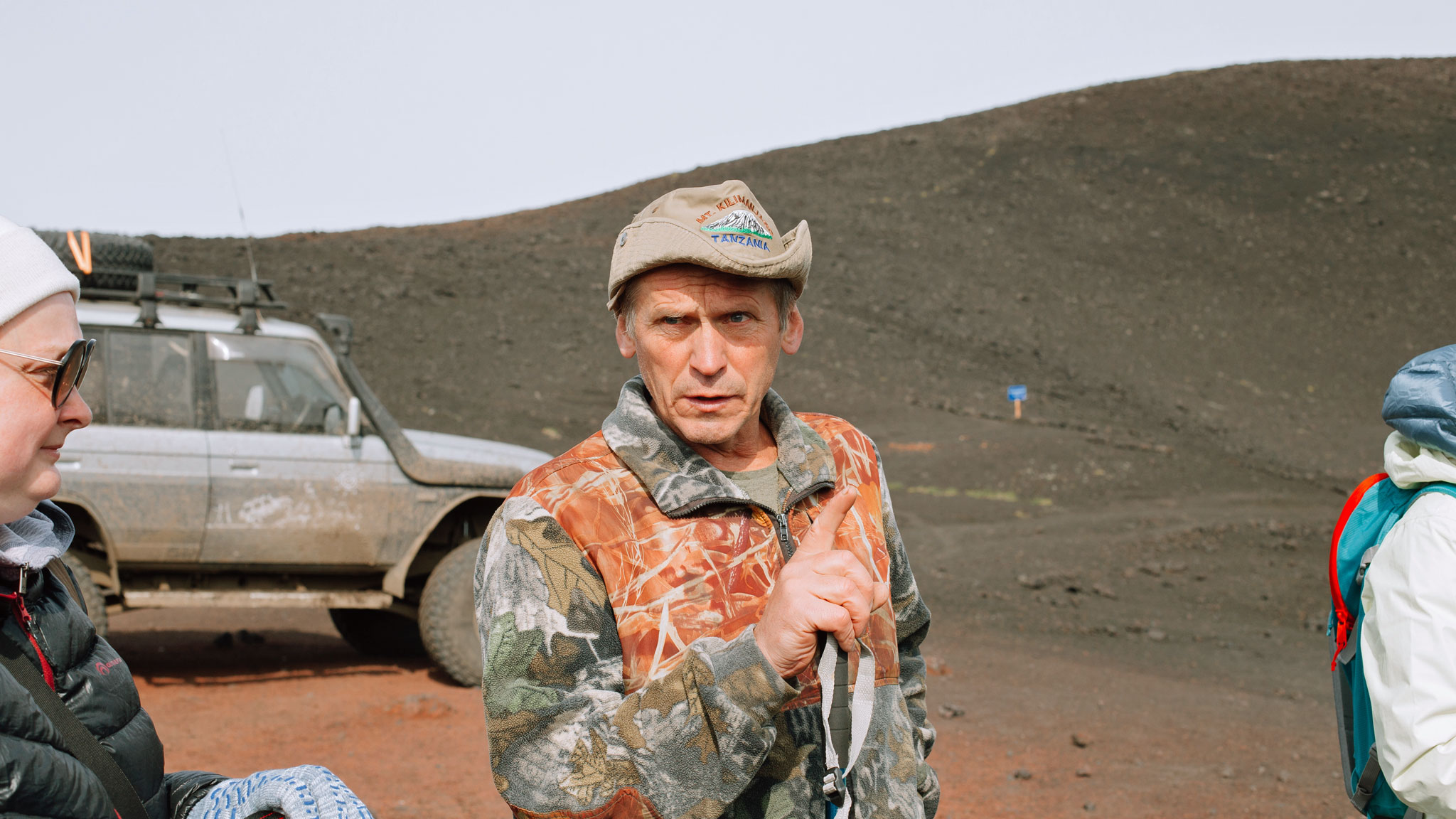 Александру Биченко 58 лет, большую часть жизни он провел на Камчатке. Занимался в местном альпклубе, путешествовал. Поднимался на вулканы и горные вершины по всему миру, даже на Эверест. Работал инспектором в парке «Вулканы Камчатки», потом перешел в отдел рекреации и экопросвещения, работает с туристическими компаниями, сопровождает группы и знакомит с Камчаткой. Вместе с ним и группой мы едем на «КамАЗе»-вахтовке из Петропавловска-Камчатского к вулкану Толбачик в Ключевской природный парк.