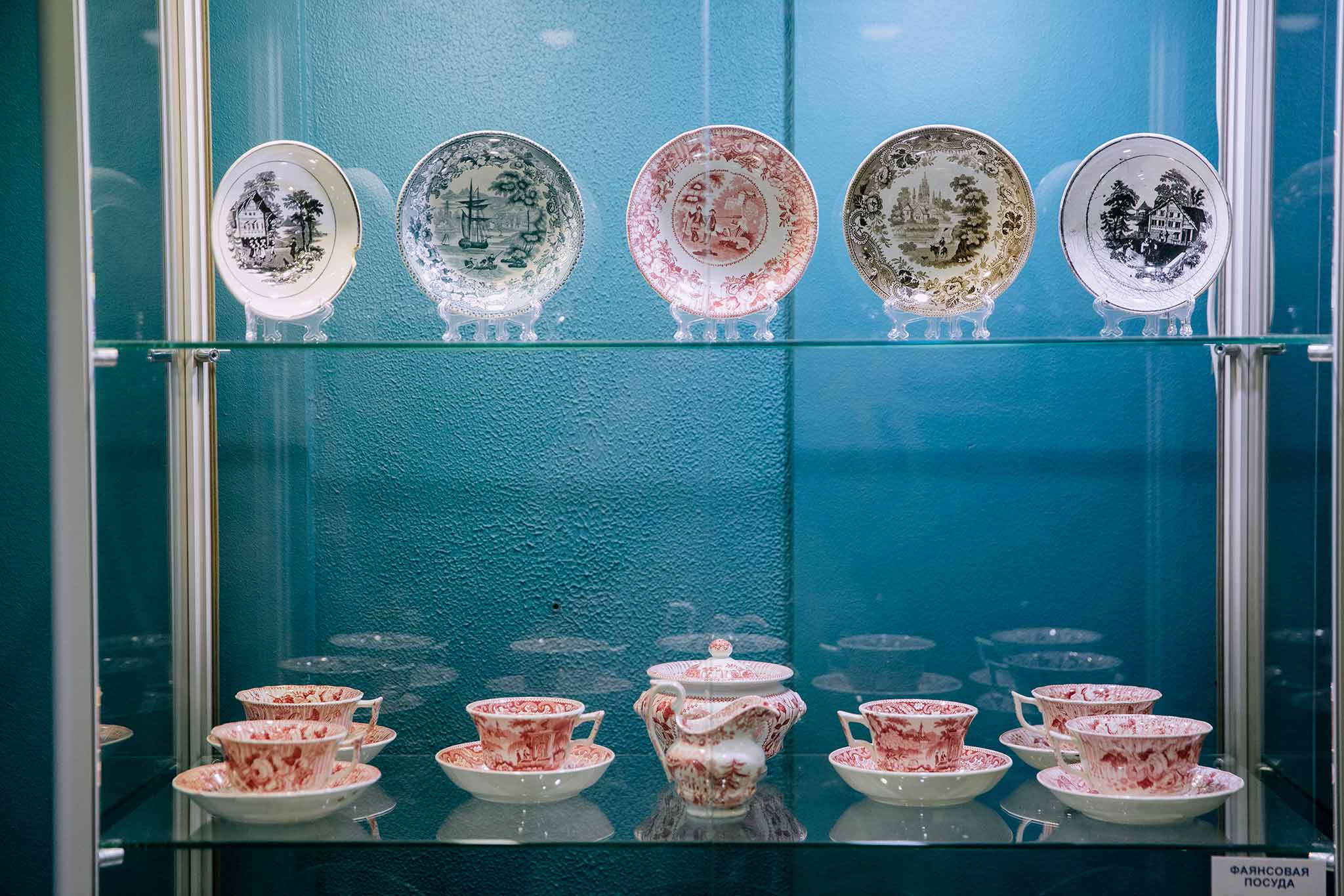 Расписные сервизы сохранились в товарных количествах. Образцы выставили в музее, но если поднять все ящики, то можно открывать магазин.