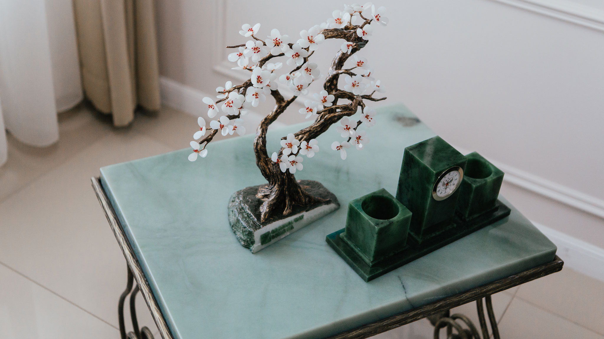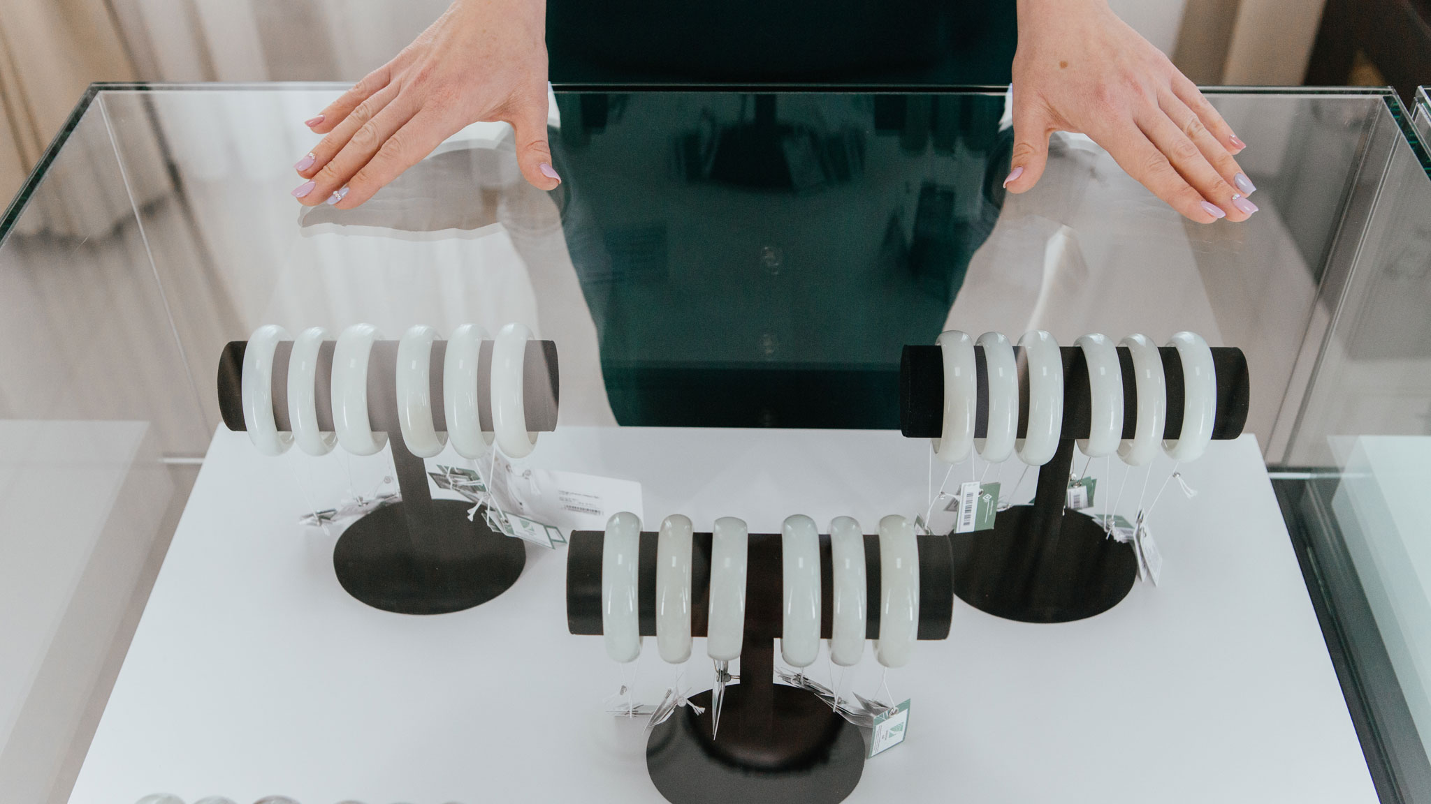 Я с сомнением прикидываю, не купить ли и мне такой полезный браслет? Эзотерика меня немного пугает. Но фабрика выглядит нарядно и технологично, как и ее шоу-рум. В производственном зале чисто, работают резчики и ювелиры. В большинстве это молодые ребята, но есть и опытные. В том числе одна женщина — пенсионер МВД, она специализируется на изготовлении нефритовых деревьев.