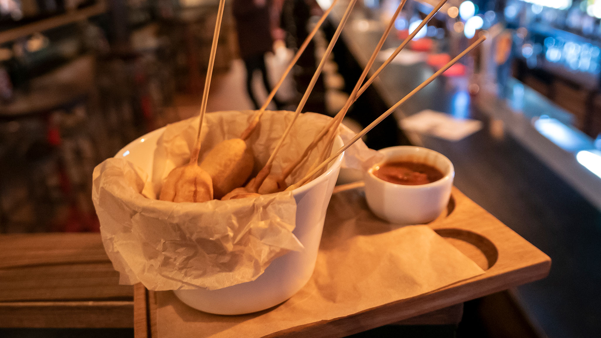 Для футбольных фанатов самая подходящая закуска — всевозможные домашние чипсы (из картофеля, бекона, мраморной говядины и даже куриной шкурки). Corn dog (360 руб.) — маленькие нанизанные на шпажки сосиски в кукурузной муке. Чуть посложнее чипсов, но тоже можно есть, не отрываясь от экрана.