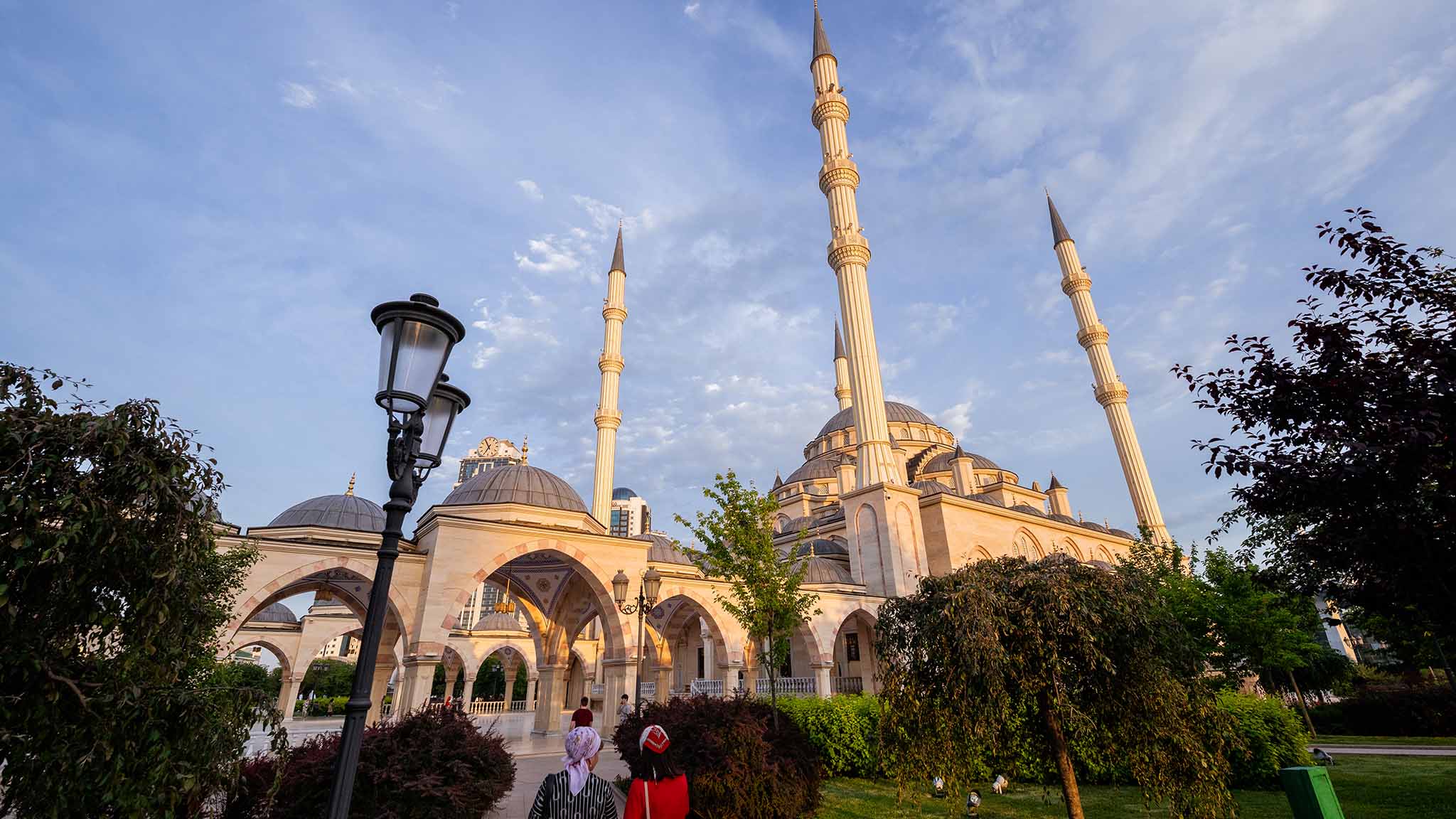 Центральная мечеть имени Ахмата Кадырова. Стены отделаны травертином — это редчайшая разновидность мрамора. Расписывать интерьеры приезжали лучшие восточные мастера. Для написания священных аятов (текст из Корана) использовали напыление из золота высшей пробы. Рядом с мечетью разбит парк, есть фонтаны, аллеи для прогулок и отдыха. Как и в прочих культовых сооружениях, туристов просят соблюдать дресс-код и правила поведения.