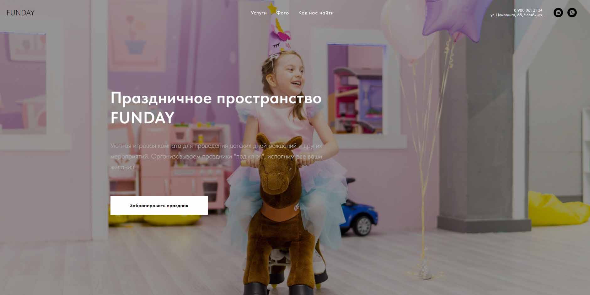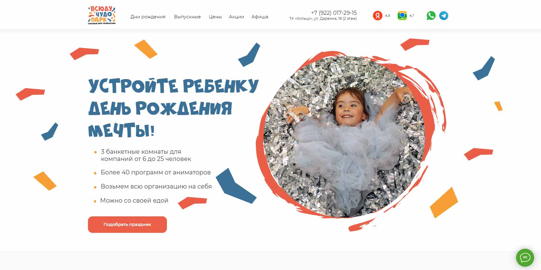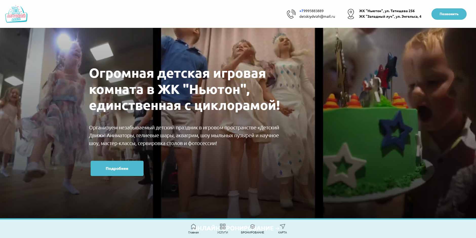 Для празднования дней рождений детей от 0 до 6 лет предлагают 3 игровые зоны, бассейн с шарами, фотозону, где именинник и его гости смогут сделать памятные фото. Аниматоры поиграют с детьми в игры, а фотограф и видеограф могут запечатлеть каждый момент праздника. Доступны к заказу различные развлекательные шоу-программы, музыкальное и световое сопровождение, можно сделать аквагрим, блеск-тату. Есть банкетная зона.