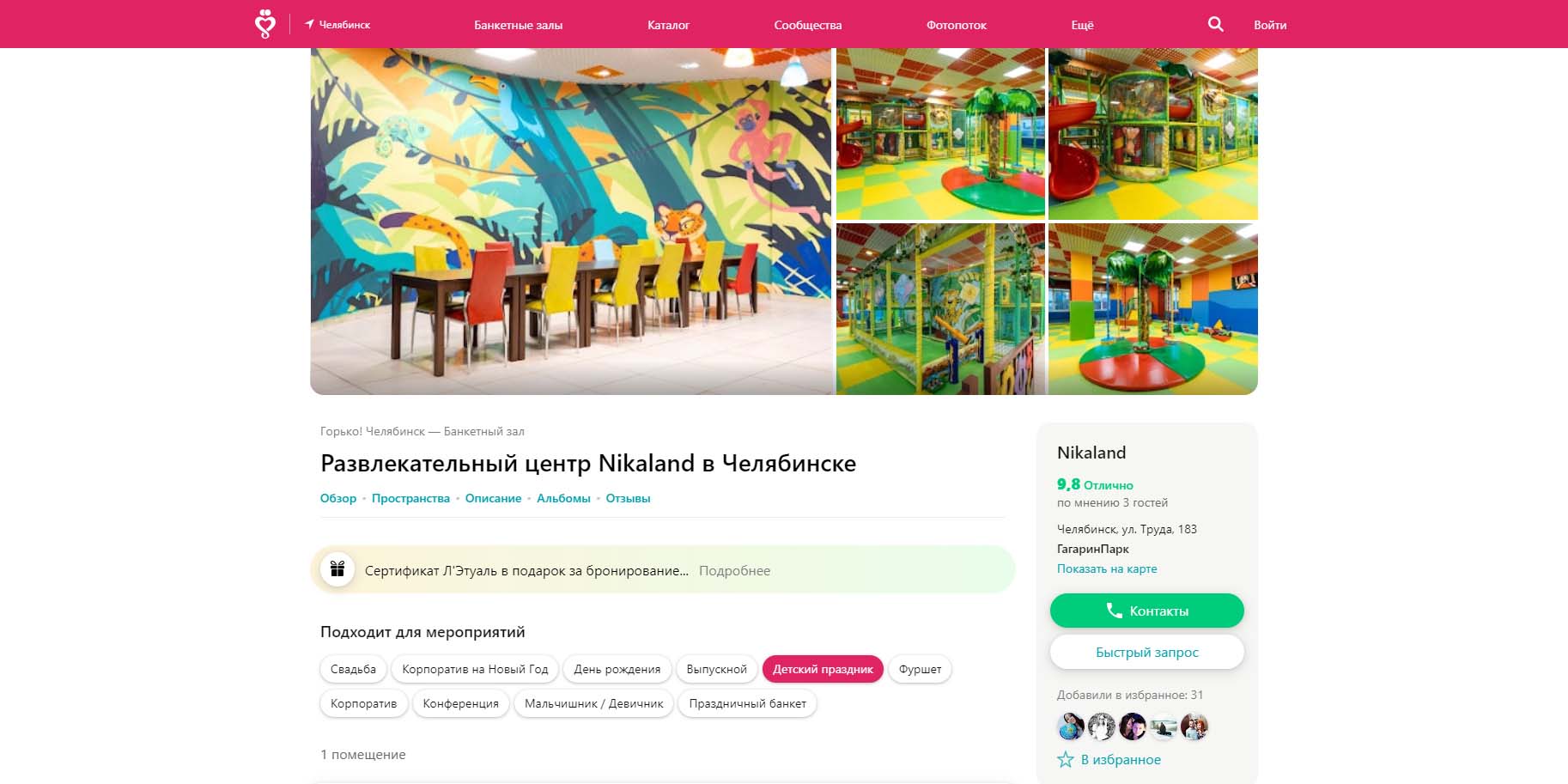 Именинник и его гости могут поиграть на двух этажах игрового пространства, где расположились лабиринт, батуты, скалодром, горка-труба. Для детей команда подготовила более 15 развлекательных и познавательных шоу-программ, а также выбор аниматоров на любой вкус. В банкетной зоне можно разместить около 30 человек. Есть место для оформления сладкого стола в тематику праздника.