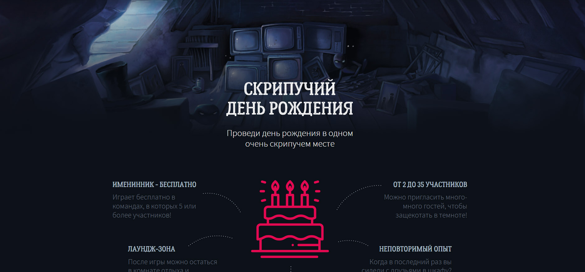 Отличная возможность весело отметить день рождения и поиграть в современную версию игры. Здесь есть тайники, лабиринты и ловушки, которые добавляют интереса и азарта. Играть могут как дети, так и взрослые. Для детей до 12 лет предусмотрен аниматор-хранитель, который всегда поможет. После игры можно отдохнуть и съесть угощения в комнате отдыха. Можно принести свою еду или заказать доставку. В комнате отдыха есть настольные игры.