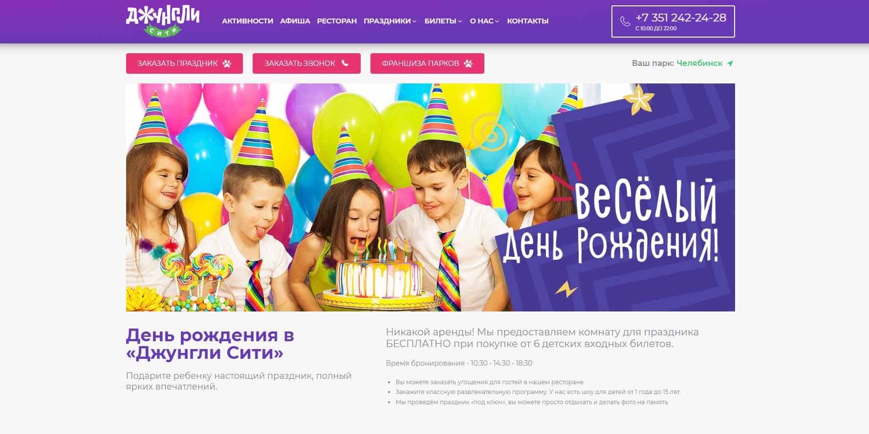 В семейном парке развлечений большой детский зал с 15 игровыми локациями для разных возрастов: горки и бассейны с шариками, лабиринт, интерактивное пространство с проекторами, аэрохоккей, ватрушки. В день рождения можно забронировать банкетные комнаты и отведать праздничные угощения — свои или заранее заказанные в кафе. У аниматоров парка разработано более 40 программ. Можно заказать поздравление от белого большого мишки или мыльное, серебряное, неоновое шоу.