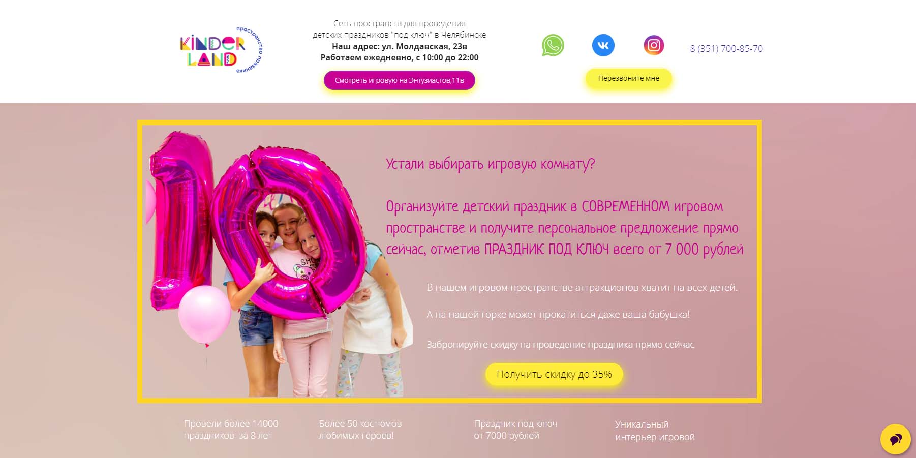 Для празднования дня рождения дошкольников предлагает игровую комнату, а для детей постарше — лофт-студию. Большой выбор программ и различных шоу. Можно сделать вечеринку в стиле Гарри Поттера, Уэнсдей, неоновое пати с мыльными пузырями. Под каждую тему свое оформление интерьера и фотозоны. Детей ожидают игры с аниматорами, пока родители отдыхают в банкетной зоне.