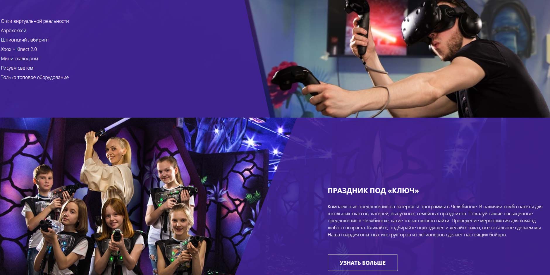 День рождения можно провести «под ключ». В пакетных предложениях — лазерные бои, аттракционы, аниматоры. Дополнительно можно заказать украшение зала и праздничного стола. Помимо этого команда предлагает шоу-программы или квесты на выбор, дискотеку, игры в приставку Xbox.