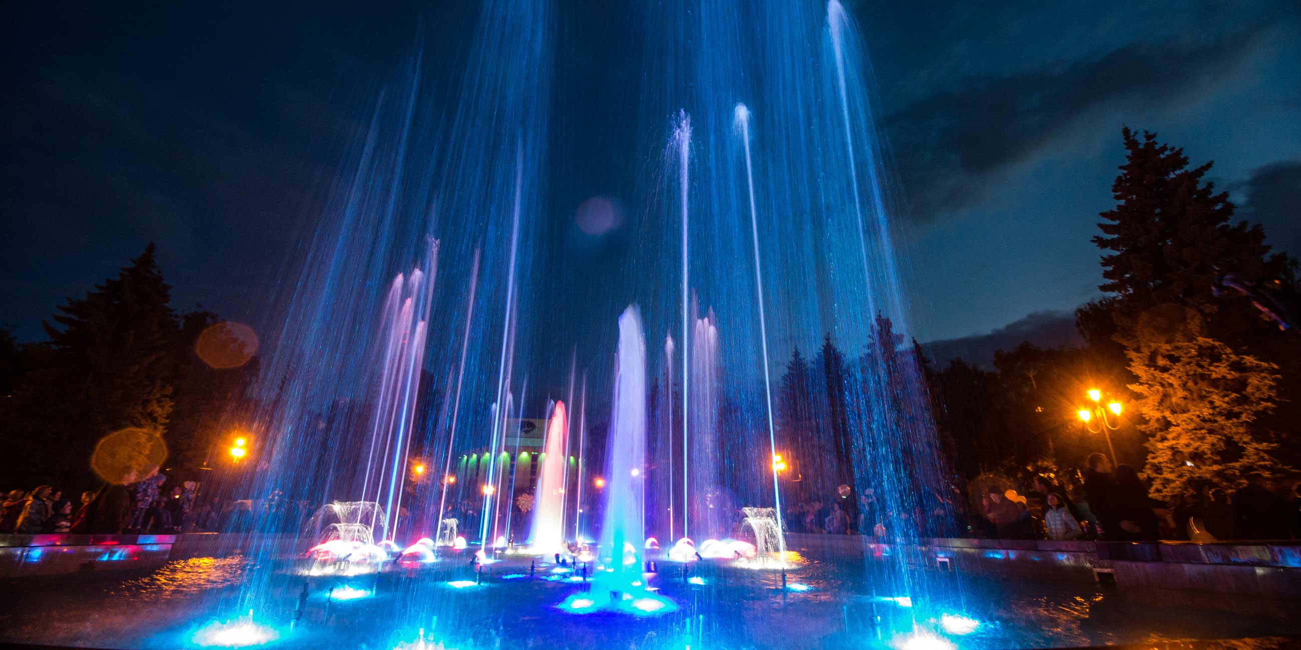 Позади здания находится городской сад имени Пушкина. А прямо перед ним — фонтан. В советские годы он выглядел совершенно роскошно, потом его запустили и на какое-то время вообще закрывали. Сейчас все отреставрировано, и это уже не один, а целый каскад фонтанов, которые по вечерам подсвечиваются и выбрасывают струи воды под музыку.