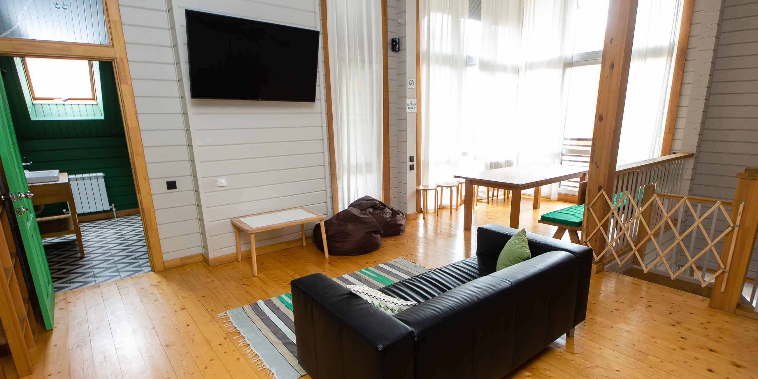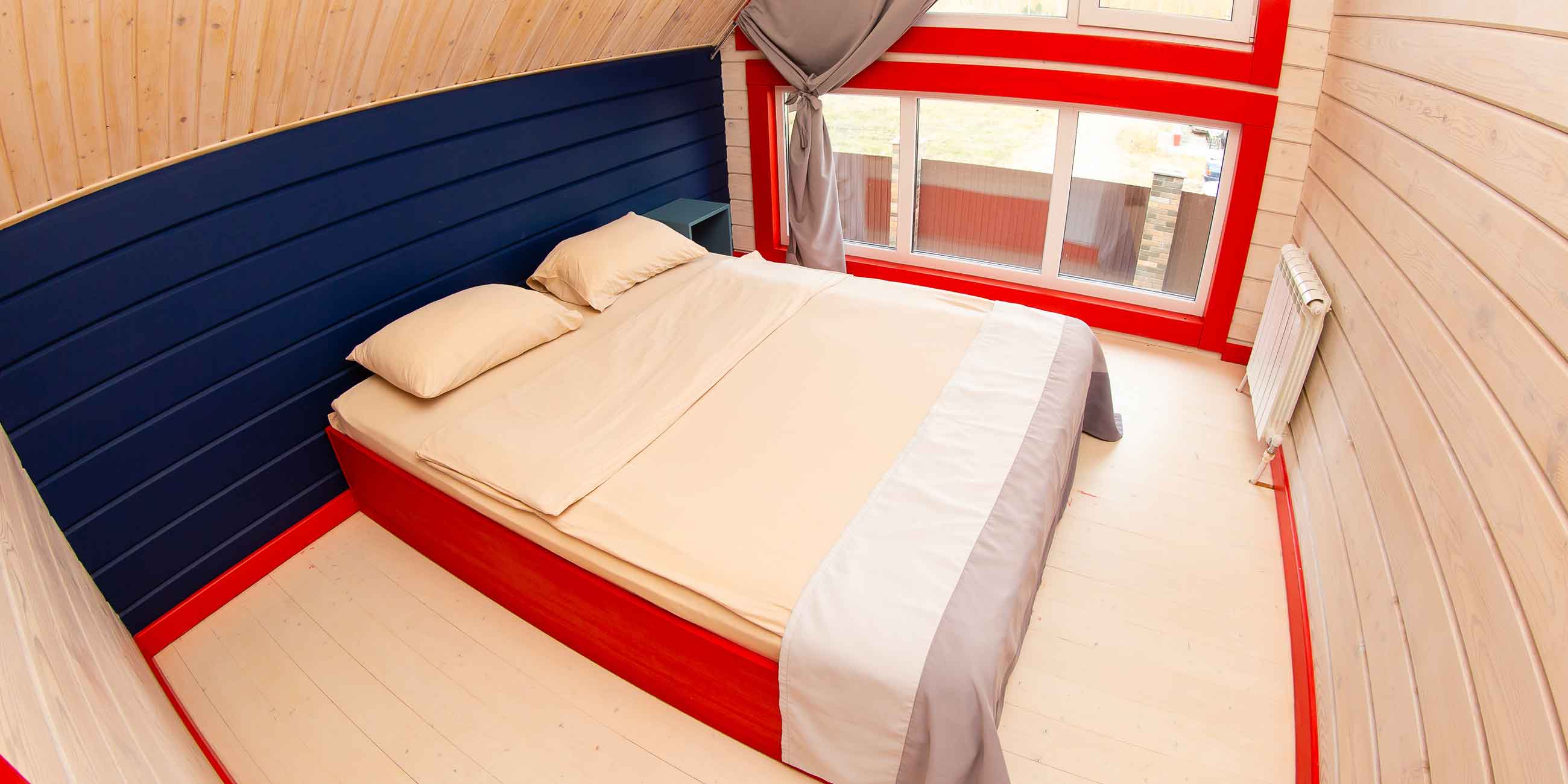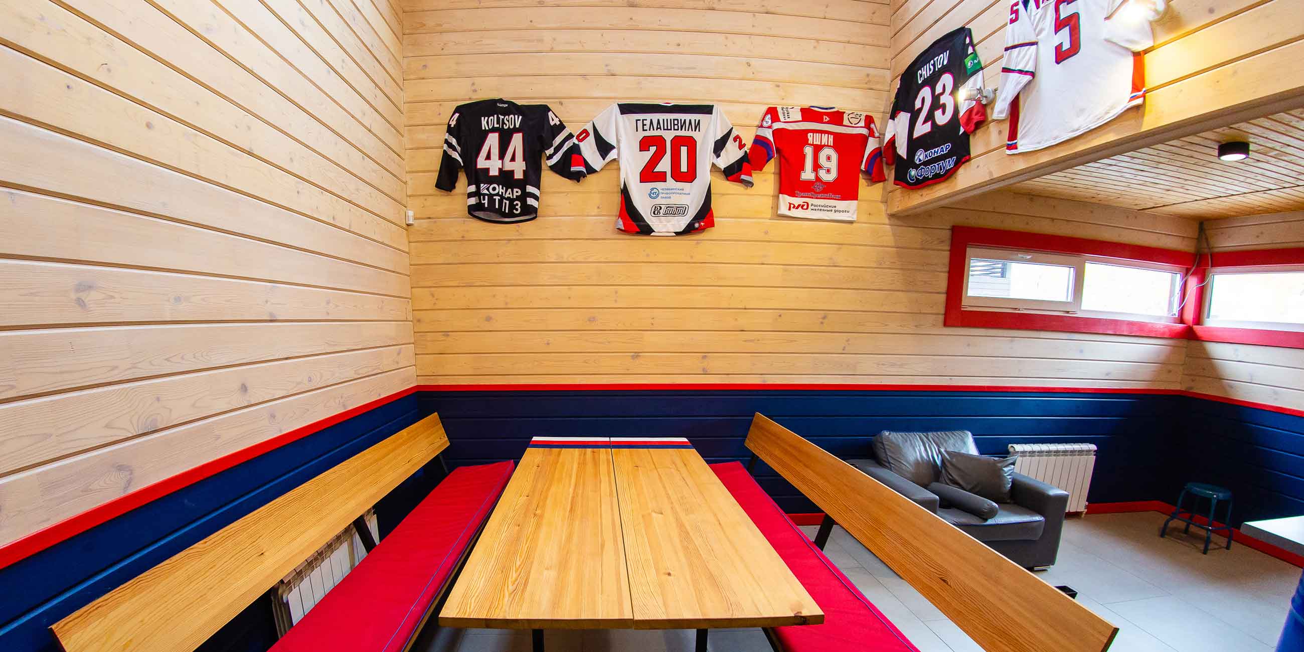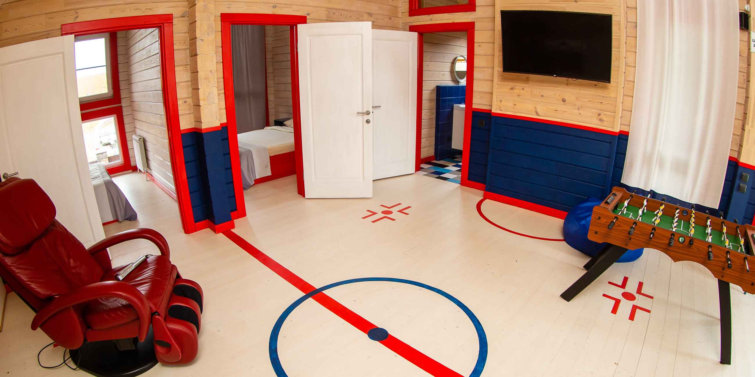 Здесь дух соревнований прямо с порога задают яркие интерьеры в стиле спортивных площадок. Посмотреть матч любимой команды и попариться в баньке – легко! В этом коттедже зона отдыха с большим телевизором расположена рядом с парной. На втором этаже вы можете устроить свой чемпионат, поиграв в настольный футбол. Бонус — массажное кресло.