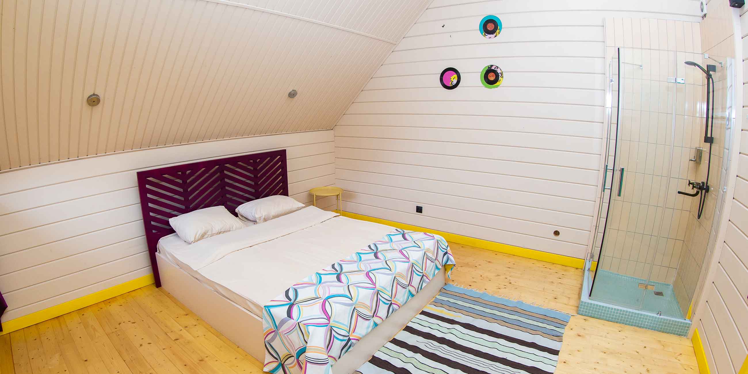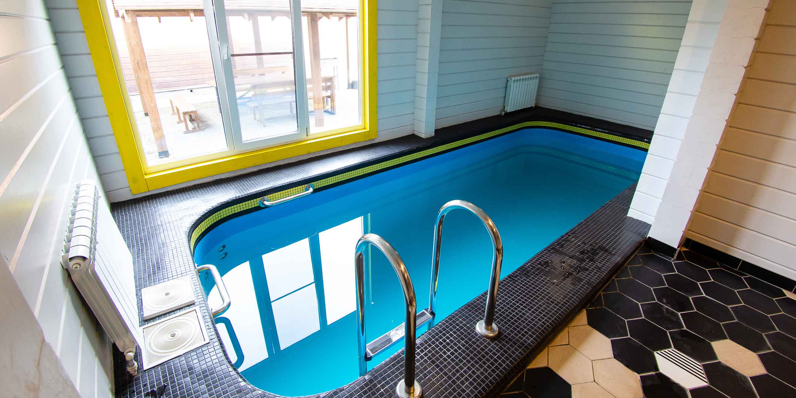 Большой зал с пилоном, диско-шаром и барной стойкой – отличный вариант для караоке-вечеринки или дискотеки. На первом этаже – просторная парная на дровах и бассейн длиной пять метров. Хорошее настроение задают яркие интерьеры.