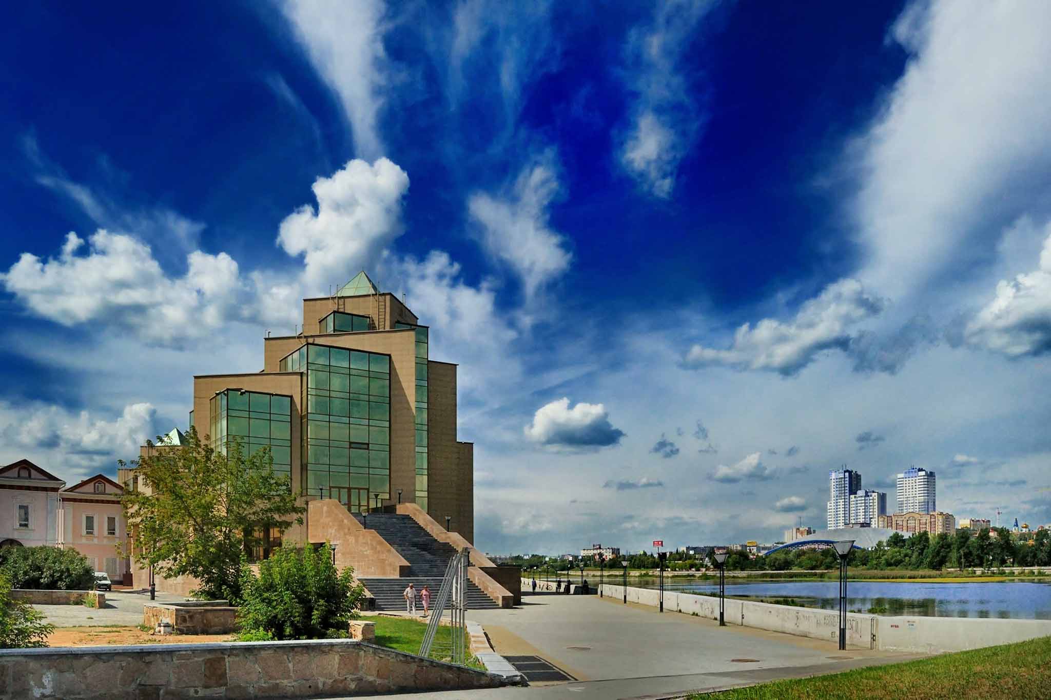 Прогулку по достопримечательностями Старо-Татарской слободы начнем с набережной озера Кабан. Отсюда открываются интересные панорамы противоположного берега Казани и красивый вид на драмтеатр Камала.