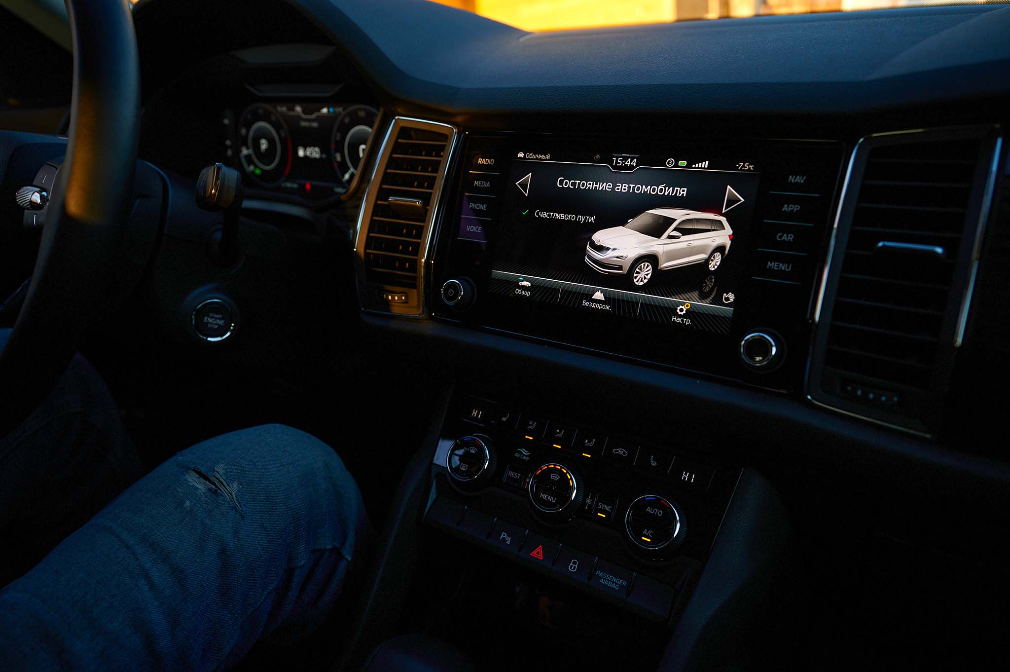 В нашей машине вертикальный дисплей с диагональю 10,4 дюйма вписан в консоль, плавно переходящую в центральный тоннель. Часть функций сенсорного дисплея продублирована физическими кнопками под ним: обдув салона и лобового стекла, аварийка, подогрев заднего стекла и переключение режимов вождения. Остальной функционал – сенсорный.