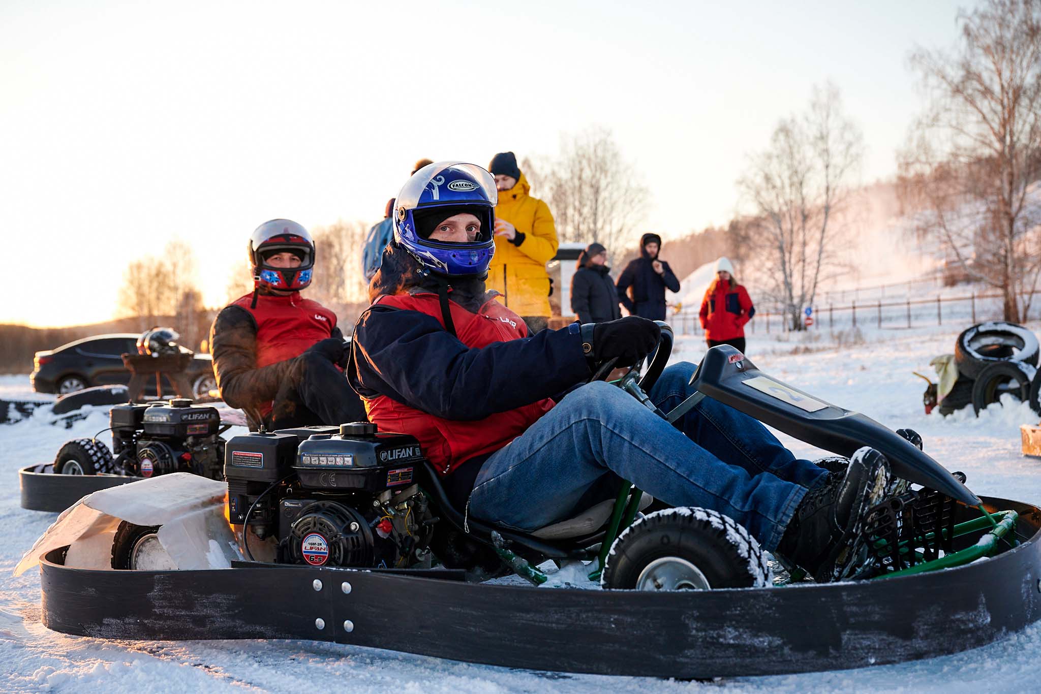 Зарядившись позитивной энергией, мы пошли осваивать картинг. Из-за снега машинки заносит еще круче, и от этого получаешь куда больший кайф! Сначала мы побаивались сильно газовать, но, привыкнув к трассе после пары кругов, нас было не остановить.