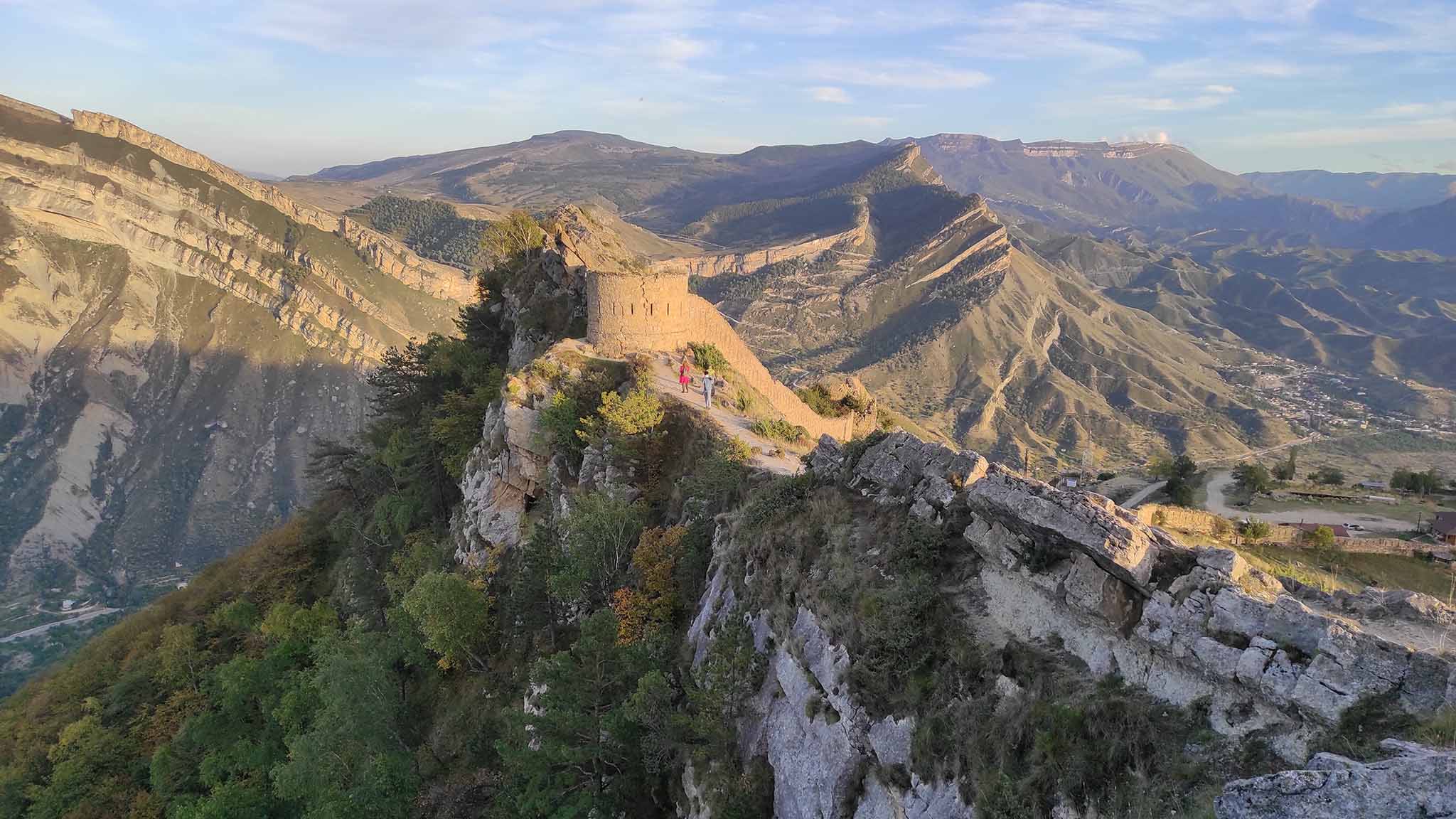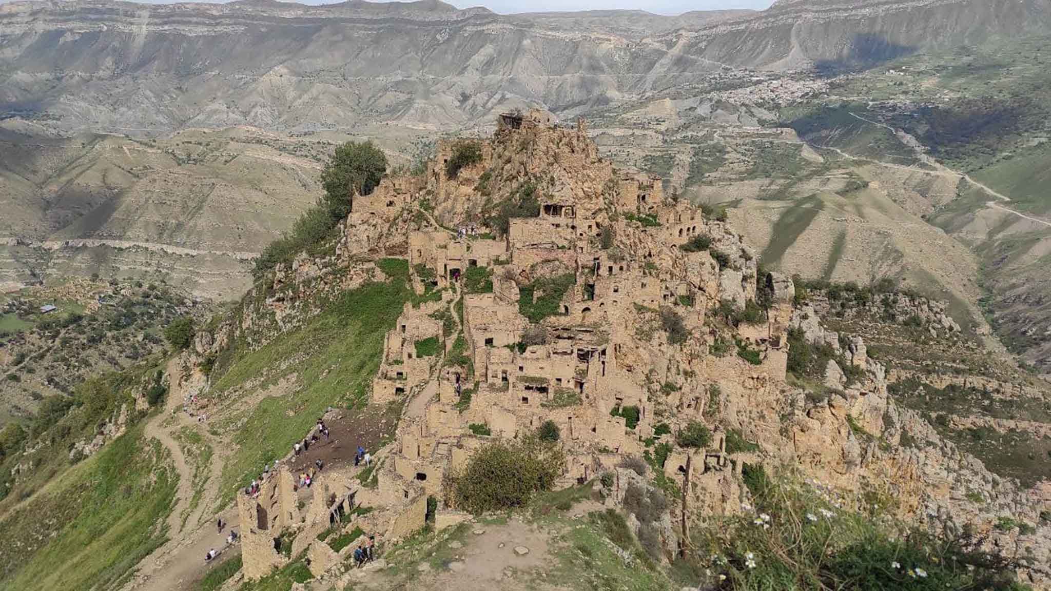 Подъем не очень крутой, но продолжительный из-за чего сил вы потратите изрядно. Но готовы спорить: как только вы поднимитесь в Гамсутль, вам не захочется сидеть на травке и отдыхать. Силы моментально вернутся при виде фантастического места. На другой части хребта стоит вполне себе живой Гуниб — большое село. Там традиционно обедают и устраивают небольшую экскурсию по обзорным площадкам.
