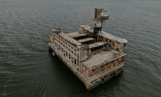 Детище талантливых инженеров Советского Союза даже с берега выглядит фантастически и напоминает какое-то большое чудовище. На суше кажется, что до цеха рукой подать, но плыть к нему больше получаса. Но вообще забираться внутрь опасно: здание ветхое и никем не охраняется.