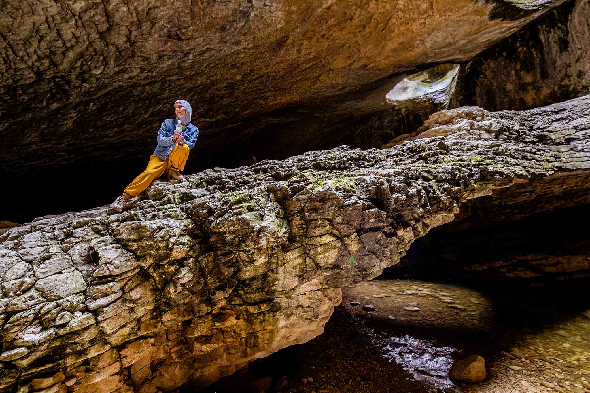 Ниже Салты в пространстве зала сохранился естественный пятиметровый мост через реку: на высоте 4 метров над руслом, шириной в два метра. Сделайте фото и здесь тоже. По дороге к водопаду сделайте снимки в теснине — на отвесных скалах встречаются папоротники.