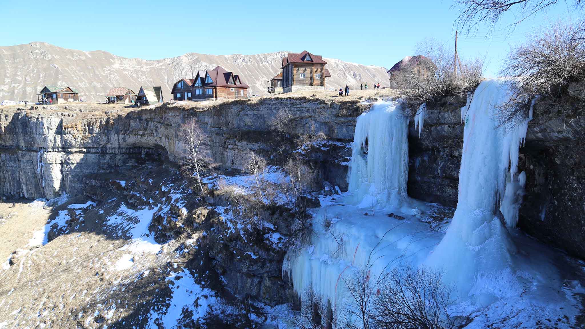 Примерно такая картина откроется тем, кто решит отправиться на плато Хунзах зимой. Водопады замерзают не часто, но здесь есть целых три таких: Итлятляр и Тобот (они находятся в одном кайоне друг напротив друга) и Матласский водопад. Зрелище ледяных водопадов завораживает, и неудивительно, что в последнее время все больше туристов стремятся встретить здесь Новый год — зимой красивее всего эти места в январе, как раз на каникулах.