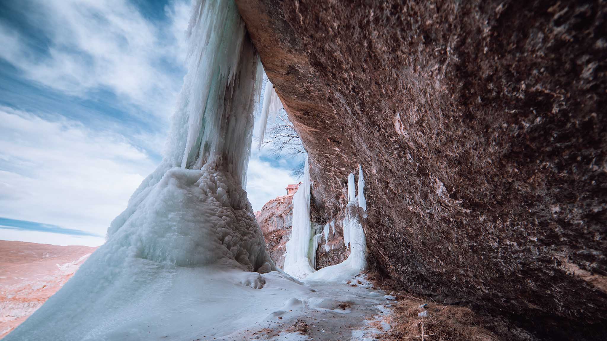 Видели ли вы когда-нибудь водопад изо льда, когда водяные брызги замерзают и превращаются в искрящиеся ледяные иглы невообразимых узоров и форм? А если это водопад высотой 100 м, а рядом еще один примерно такой же? И над ними парят орлы, как будто охраняя сверкающие сокровища.
