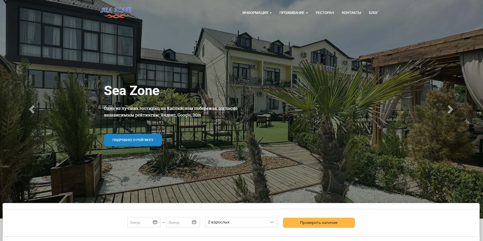 Если хотите остановиться на первой береговой линии, в стороне от центра Дербента, выбирайте гостиницу рядом с песчаным пляжем. Для комфортного отдыха можно забронировать семейный номер со всеми удобствами из одной или двух комнат. С большой открытой террасы, из окон отельного кафе и почти из всех номеров видно море. Постояльцы пользуются сауной, а когда на Каспии штормит — открытым бассейном с оборудованной зоной отдыха.