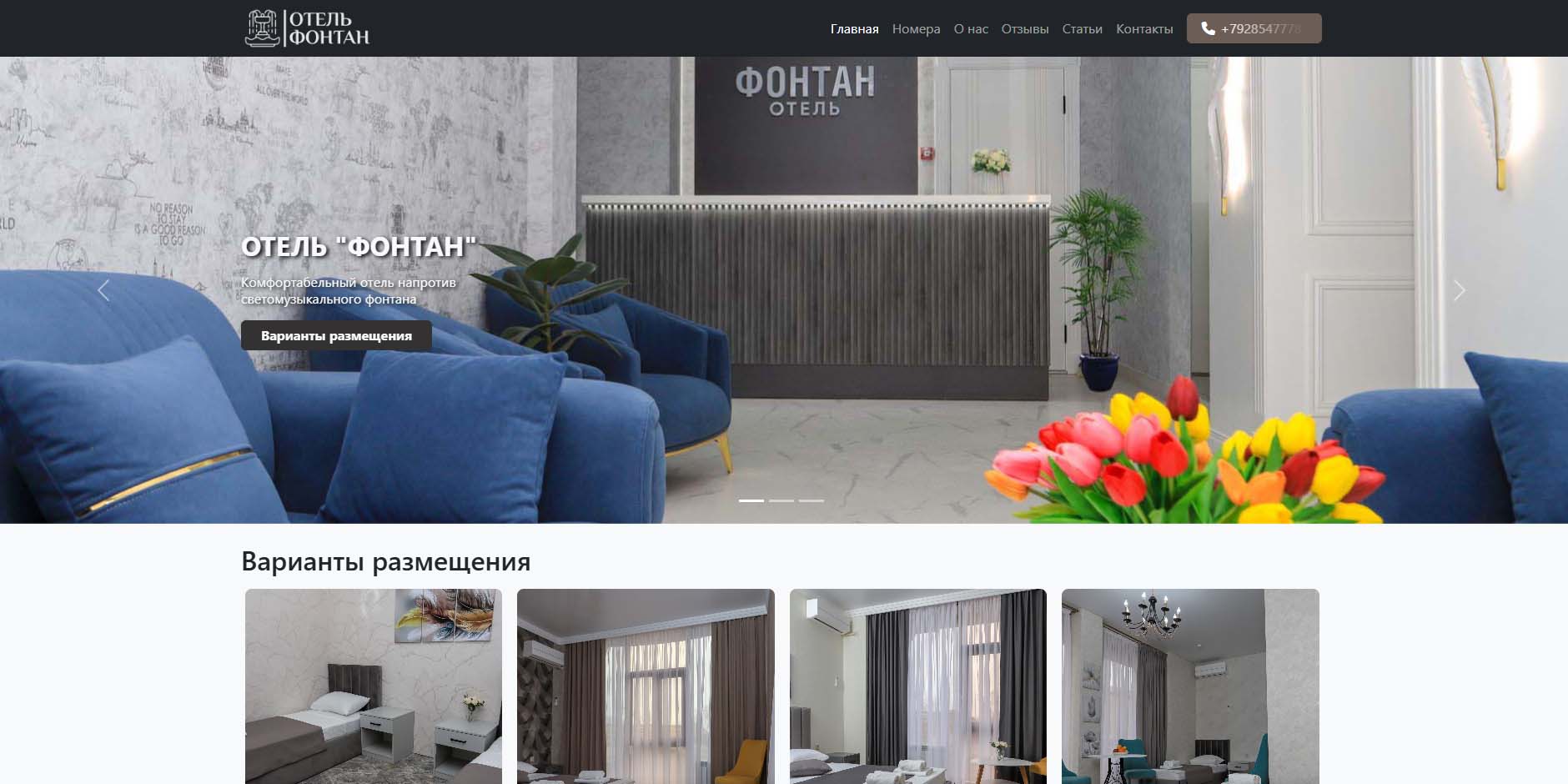 Гостиница, расположенная в 1 км от моря, оправдывает свое название — из большинства помещений открывается вид на главный городской фонтан. Туристы отмечают выдержанный скандинавский стиль оформления комнат, чистоту и доброжелательную работу персонала. В отеле есть собственный ресторан, где готовят блюда европейской, русской и дагестанской кухни.