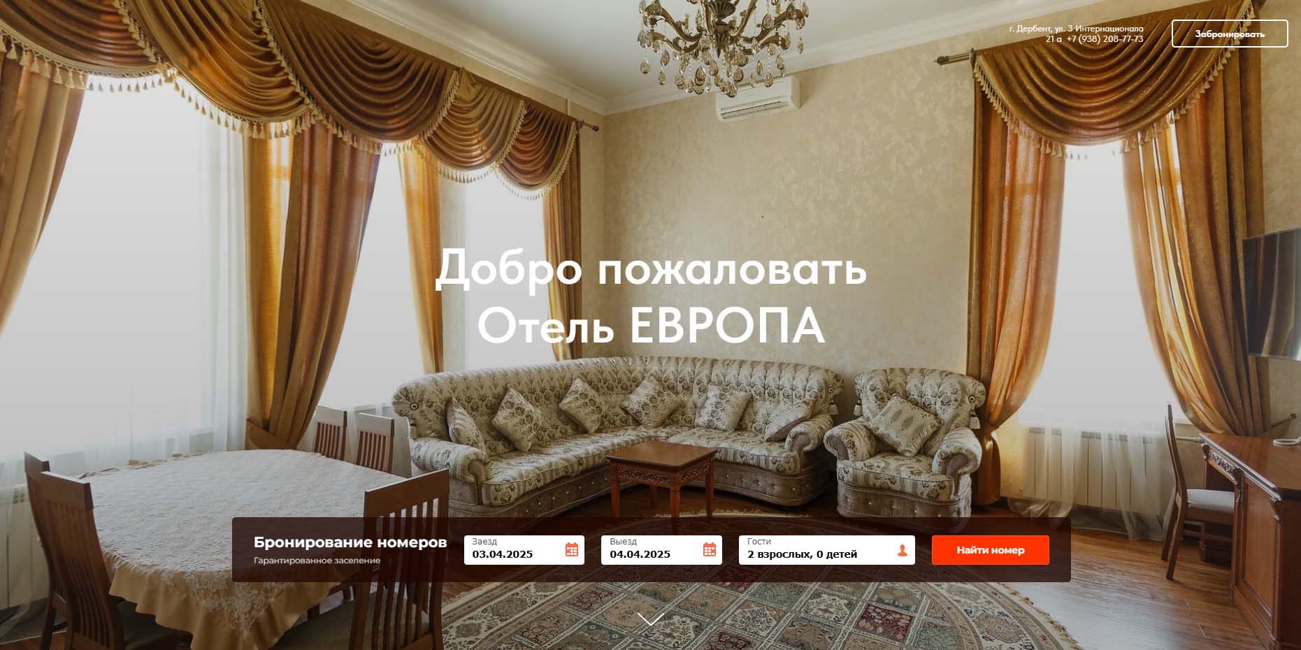 Городская гостиница уровня 4 звезды — аккуратное трехэтажное здание в самом центре Дербента. Отсюда легко дойти до моря, парка Свободы, мемориального музея Бестужева-Марлинского и других достопримечательностей города. Гостям предлагают поселиться в двухместных номерах и семейных полулюксах площадью 23–33 кв. метра.