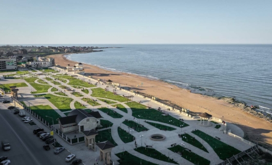 В сквере у пляжа разбиты десятки клумб, бьют три фонтана, установлена большая арка в виде сердца и еще несколько полукруглых, соединенных между собой в небольшой тоннель. Перед двухуровневой ротондой с колоннами выложена круглая площадь с надписями на плитке и узорами. Есть еще две ротонды по краям набережной и несколько беседок.
