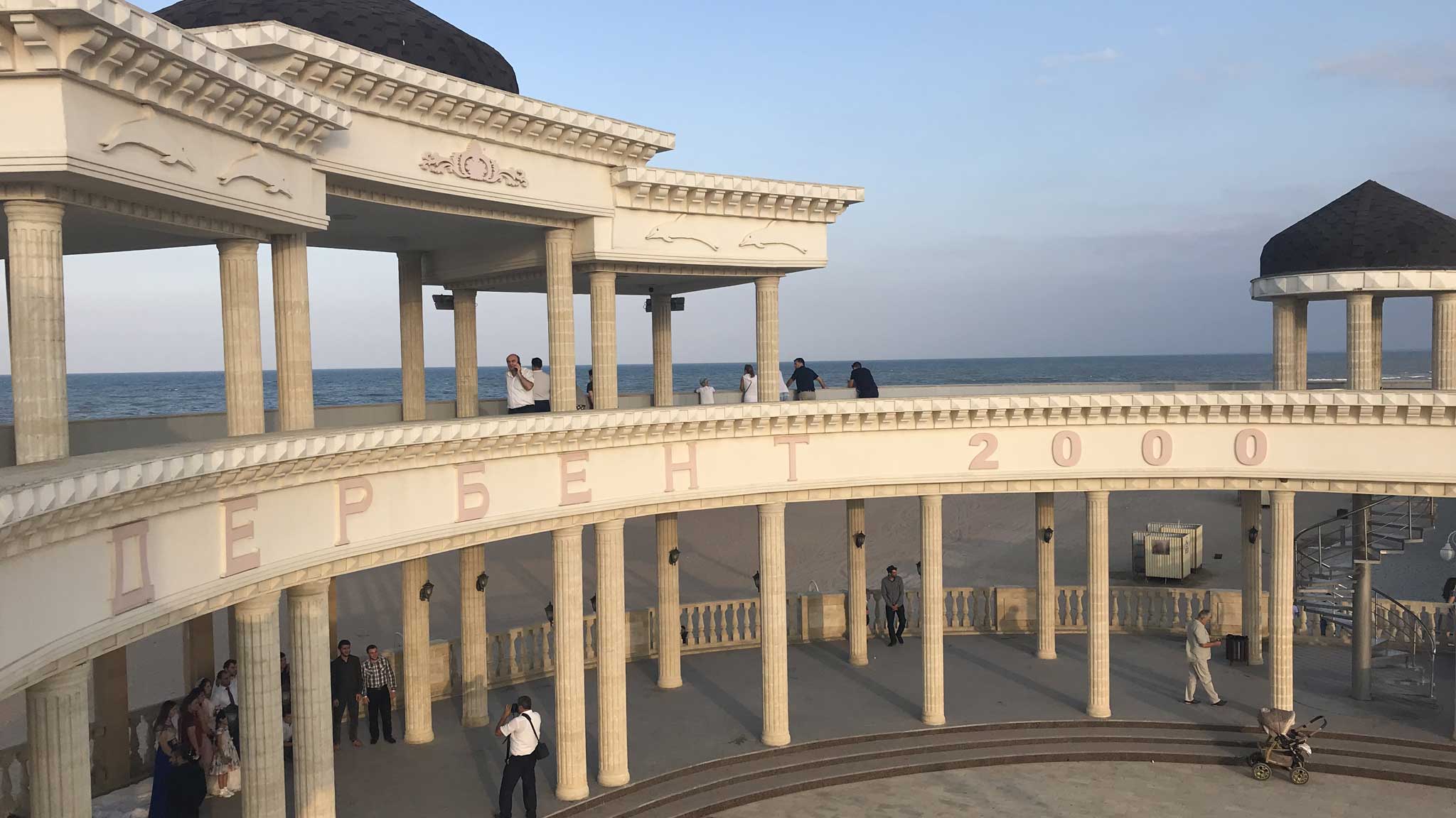 Напротив центрального входа на набережную увидите высокую двухуровневую полукруглую ротонду с надписью о солидном возрасте — «Дербент 2000». На второй этаж ведет винтовая лестница. Там с обзорной площадки и принято любоваться морскими пейзажами и городом.