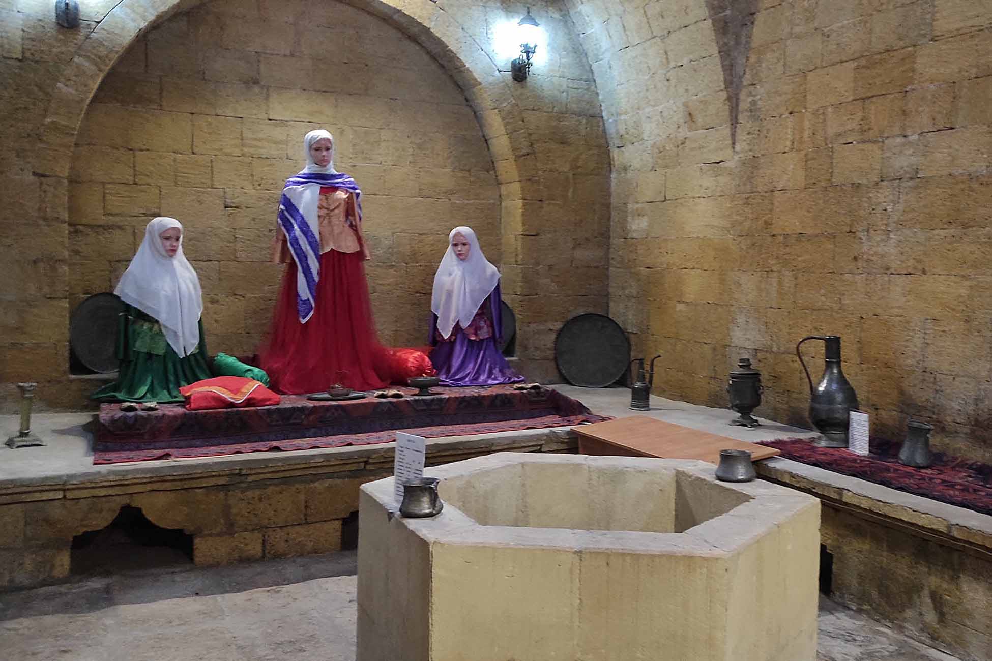Девичья баня XIII века находится в седьмом магале старой части Дербента. Традиционное для исламского Востока сводчато-купольное сооружение на 2,2 метра уходит под землю. Длина фасада — 13 метров, а высота над уровнем дороги — 3. В стене увидите два дверных проема: первый ведет в котельную, а второй — в саму баню. Когда-то сюда ходили мыться только незамужние девушки в компании подруг. И зачастую — перед свадьбой. Сейчас в бане открыта посвященная этому факту истории музейная экспозиция.