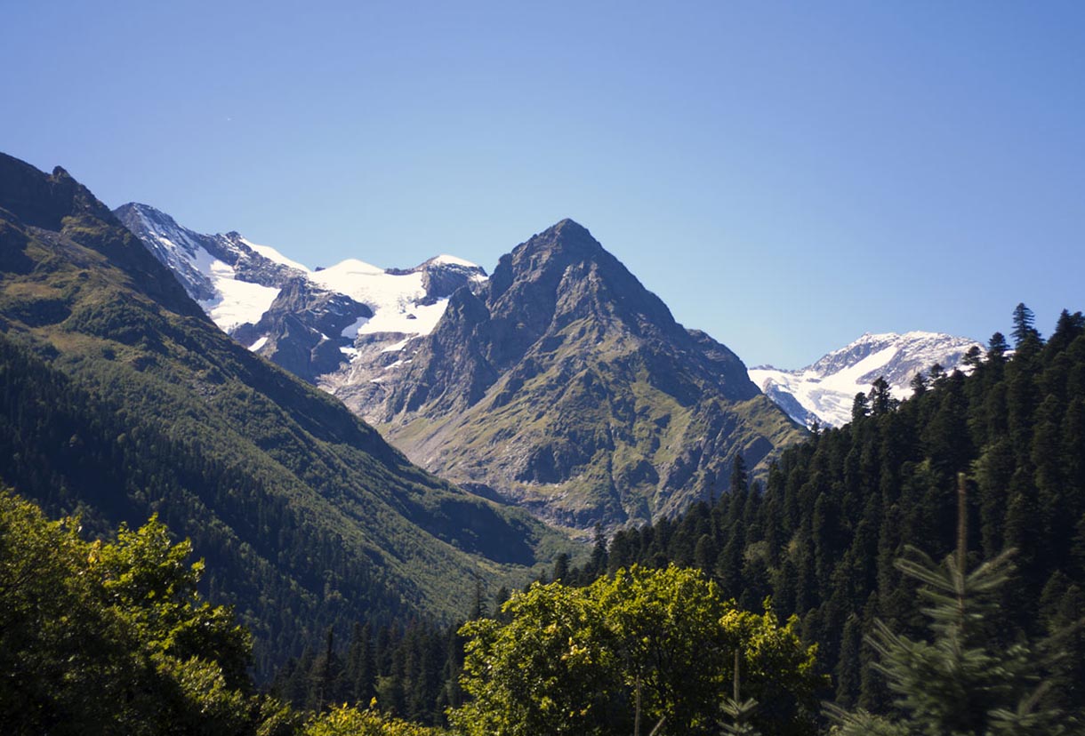 Крутые пики домбайских гор покоряют своим видом даже самых невозмутимых путешественников. Одни вершины укрыты вечным снегом, другие на лето приоткрывают свои пики, уступая место робкой растительности. А на склонах вовсю бушует кавказское разнотравье, шумят реки и леса.