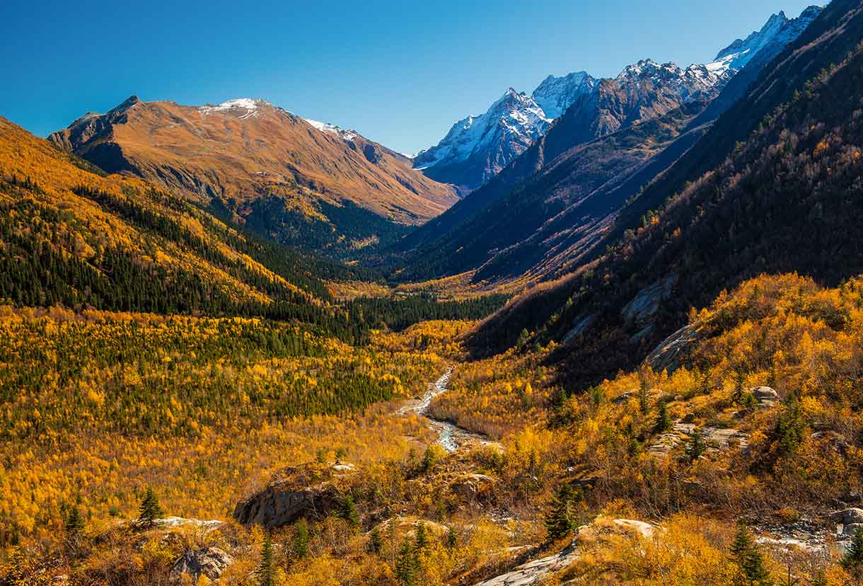 Украшают домбайский пейзаж бурные реки и снежные шапки на вершинах хребтов, где зима начинается уже в середине-конце сентября. Хотя в долине средняя дневная температура этого месяца почти +12 градусов.