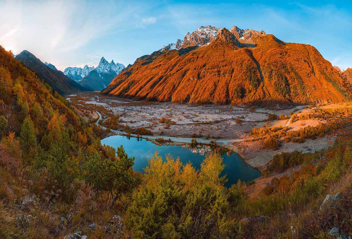 В начале месяца можно искупаться в самом теплом высокогорном озере Тебердинского заповедника Кара-Кель, куда тоже водят тургруппы. А еще — загорать на поляне и собирать малину с черникой. Доступны в это время и полеты на дельтапланах. Золотая осень потихоньку наступает на стыке сентября и октября.