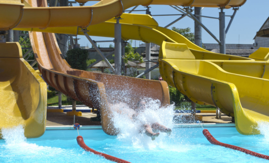Можно освежиться под гигантским ведром, из которого льется вода, отдохнуть в кафе-баре, позагорать в тени настоящей пальмовой аллеи. И, конечно, устроить тест-драйв каждой горке.