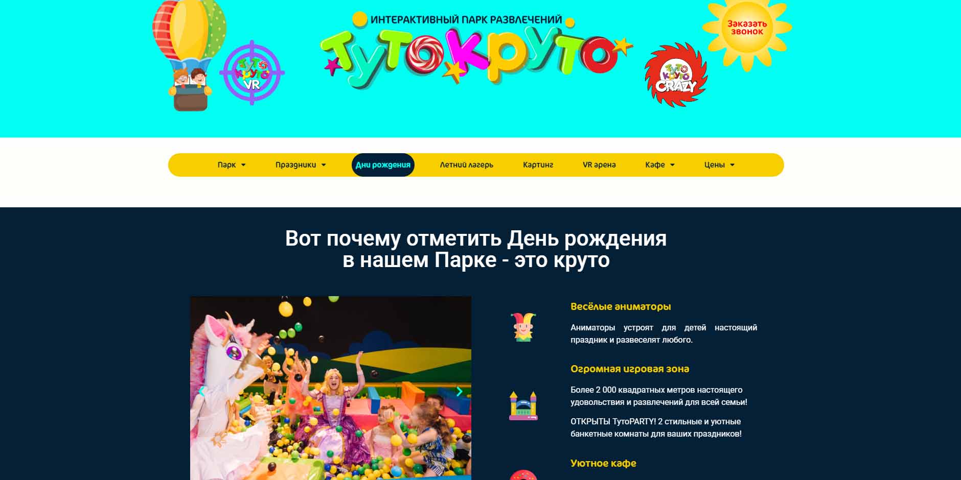 Интерактивный парк — это три вида лабиринтов с пушечным фортом, батутная арена, веревочный парк, активити-аттракцион «Ниндзя-квест», а также качели, карусели и другие аттракционы. Аниматоры парка устроят веселый день рождения для ребенка от 1 года до 14 лет. Игровая зона расположена на площадке более 2 тысяч квадратных метров. Кроме того, в парке есть две отдельные банкетные комнаты для проведения праздников, а также уютное кафе. Специально для маленьких гостей разработаны три сета именинника на выбор из самых популярных блюд.