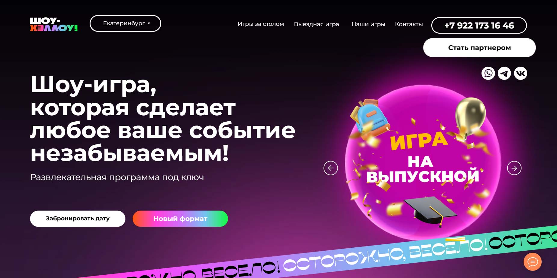 Выпускной в стиле телевизионных шоу, где соревнуются две команды. Гостей ждут раунды с заданиями на смекалку, реакцию и знание песен, мультфильмов и кино. В конкурсную программу добавляют слова с тематикой выпускного вечера. Также можно арендовать фуршетную зону и воспользоваться услугами фотографа. Проводят выездные мероприятия на площадке клиентов.