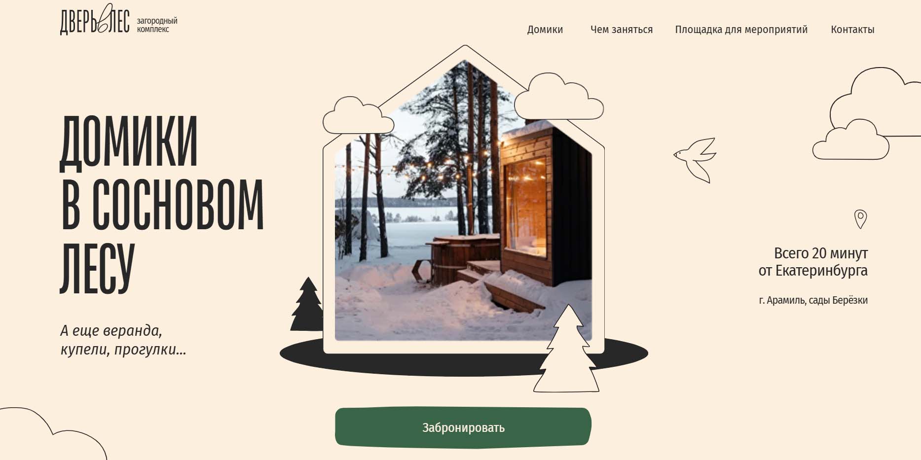 В глэмпинге «Дверь в лес» комфортные домики оформлены в скандинавском стиле. Выходя из них, сразу попадаешь в атмосферу леса с пением птиц. У каждого домика территория удобно обустроена, здесь горячая купель, мангал, веранда с креслами и уличный стол. Все это в окружении соснового леса. Для познавательного отдыха можно совершить прогулку на велосипедах до города Арамиль и посетить тематический «Парк Сказов».