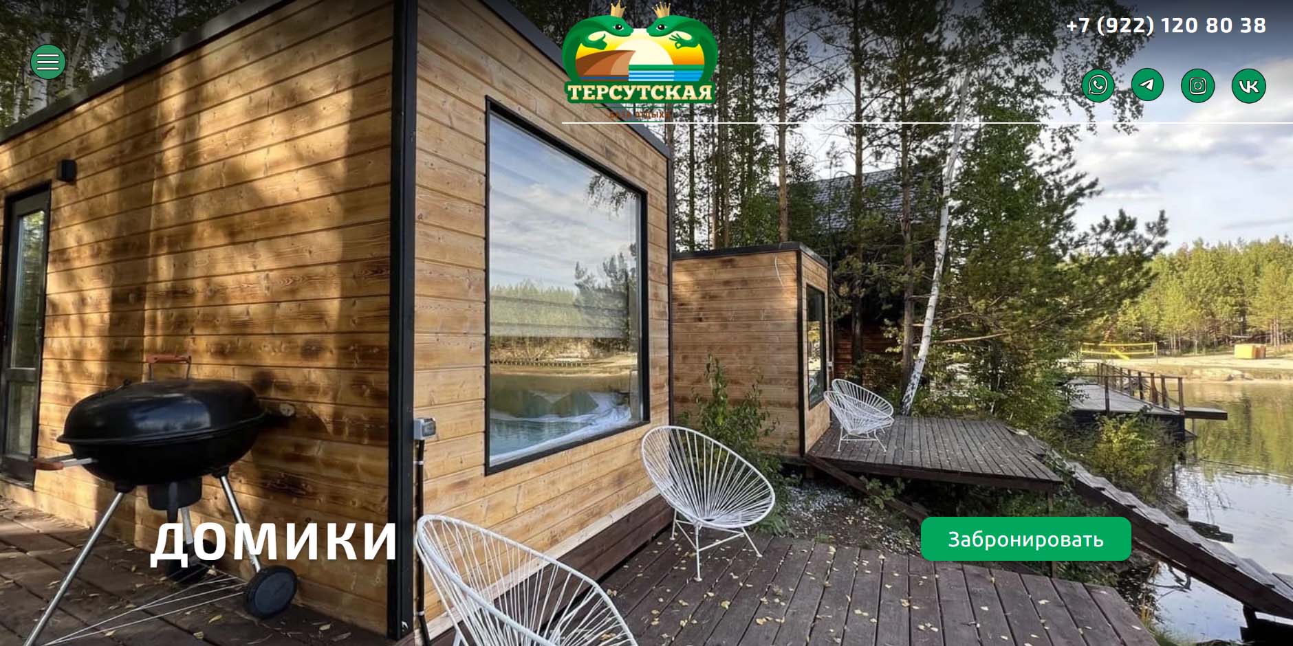 База отдыха «Терсутская» предлагает для размещения небольшие двухместные домики, просторные коттеджи для компании и отдельные номера в домах. Все они расположены на берегу лесного озера, где обустроен пляж с белым песочком, а также есть водный трамплин и горки. Для комфортного отдыха круглогодично работает подогреваемый бассейн с гейзером и гидромассажной зоной. Для гостей работает кафе, есть баня, беседки с мангалом. Зимой можно отправиться в путешествие на снегоходах, прокатиться на банане, покататься на коньках и с ледяной горки. Для крепких духом организована зимняя купель.