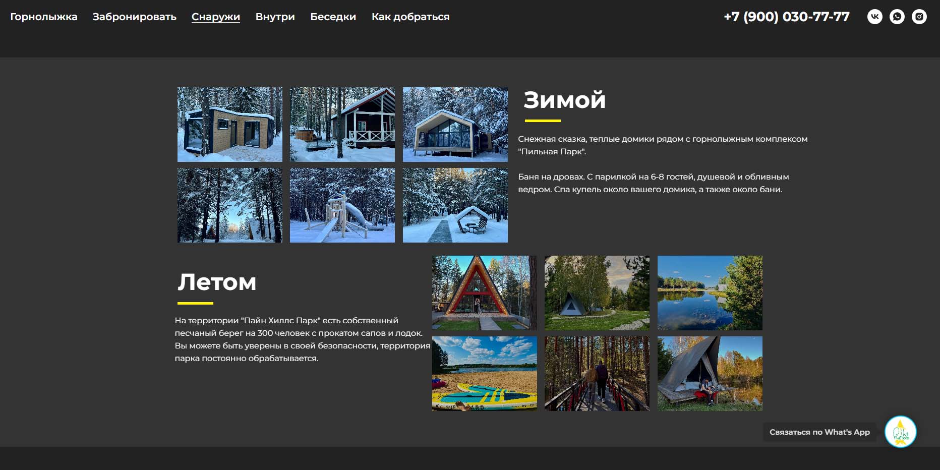 В тишине леса и вблизи водоема в любую погоду будет тепло и комфортно в домиках глэмпинга. Огромная территория соснового бора и собственный песчаный пляж притягивает сюда туристов летом. Зимой этот парк занимают любители горных лыж и сноуборда, так как рядом есть горнолыжный склон. Для гостей есть баня на дровах и спа-купели.