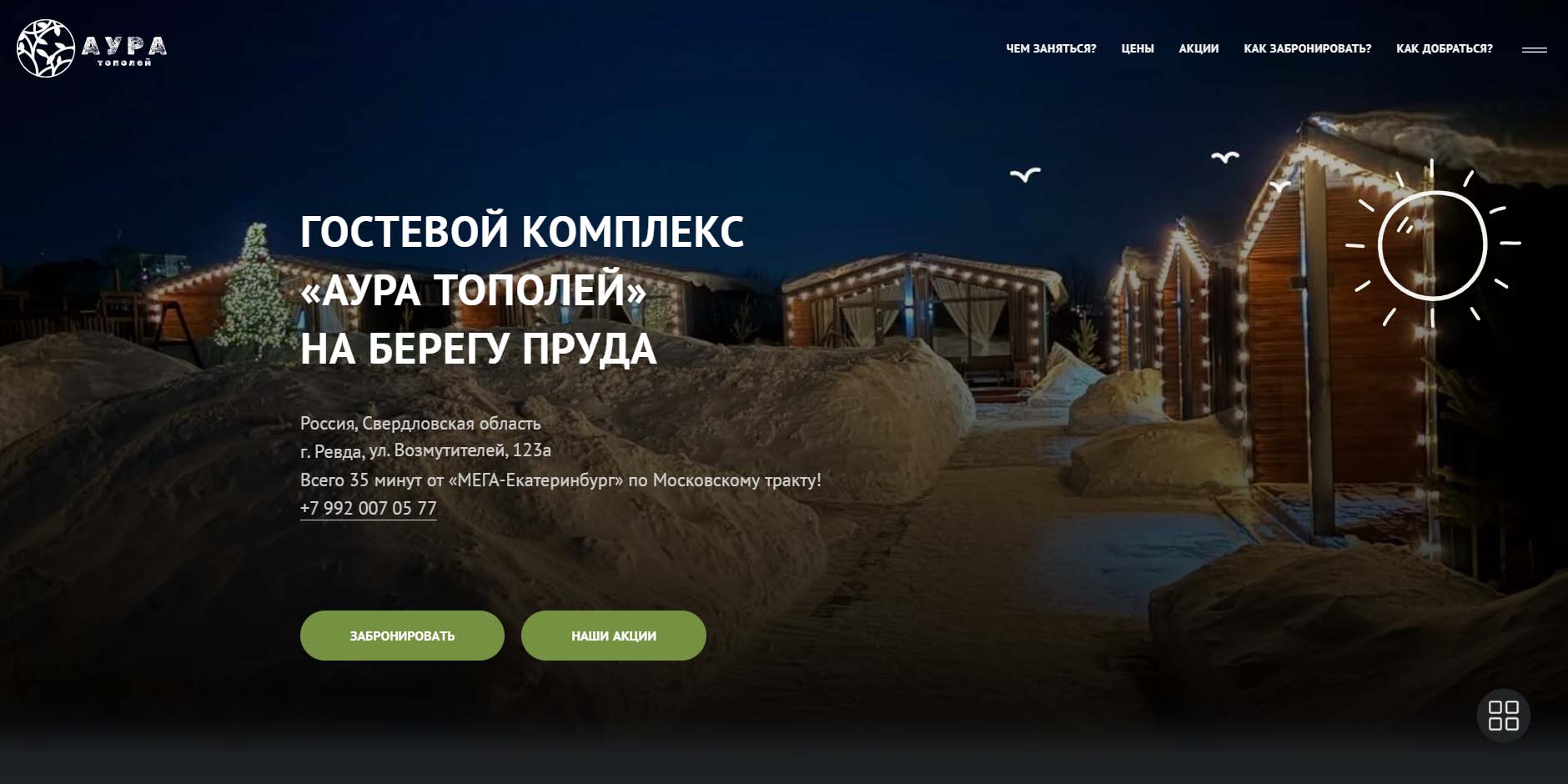 На берегу большого водохранилища расположился гостевой комплекс «Аура тополей» со своим пляжем и с удобным входом в воду. Близость водоема располагает к рыбалке и прогулкам на лодке. На территории есть спортивная площадка и детский городок, но упор здесь сделан на предоставлении банных услуг. Гости могут нанять парильщика и воспользоваться услугами массажиста.
