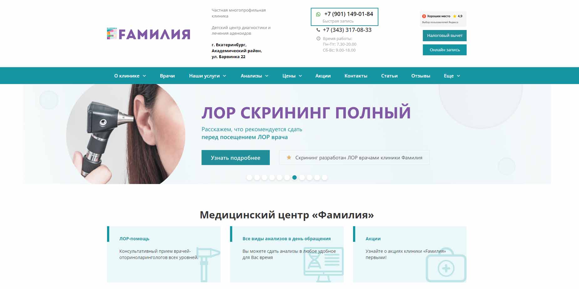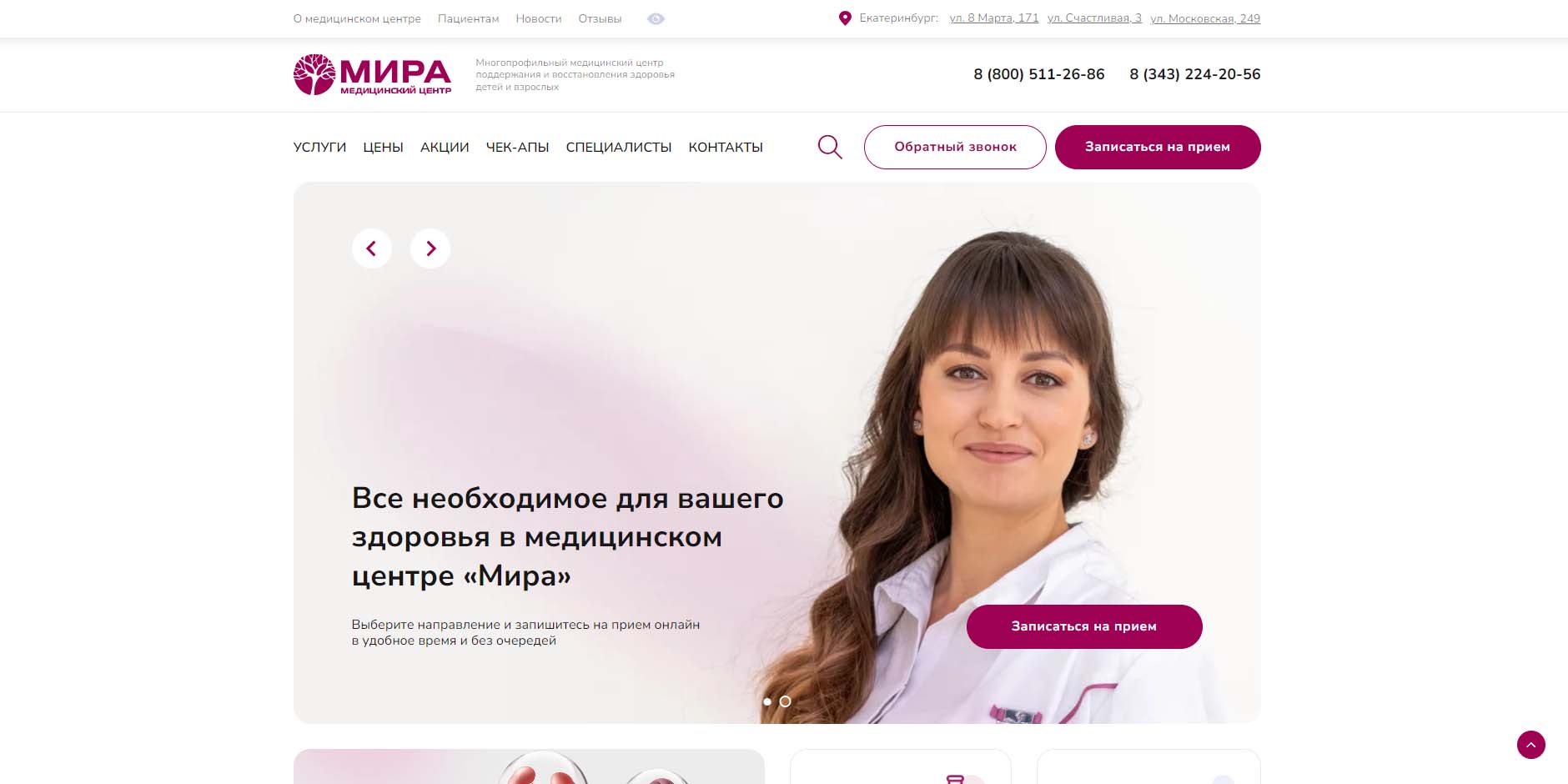 В Екатеринбурге открыты 7 клиник этой сети. Первая открыла свои двери для пациентов в январе 2009 года и быстро приобрела репутацию экспертного медцентра с опытными врачами, современным оборудованием и уникальными компетенциями. В год здесь принимают около 500 тыс. человек. Сегодня в состав медицинского учреждения входят поликлиники, центр МРТ, травмпункт, семейные клиники, хирургический стационар и диагностический центр. Работают 250 врачей разной специальности.