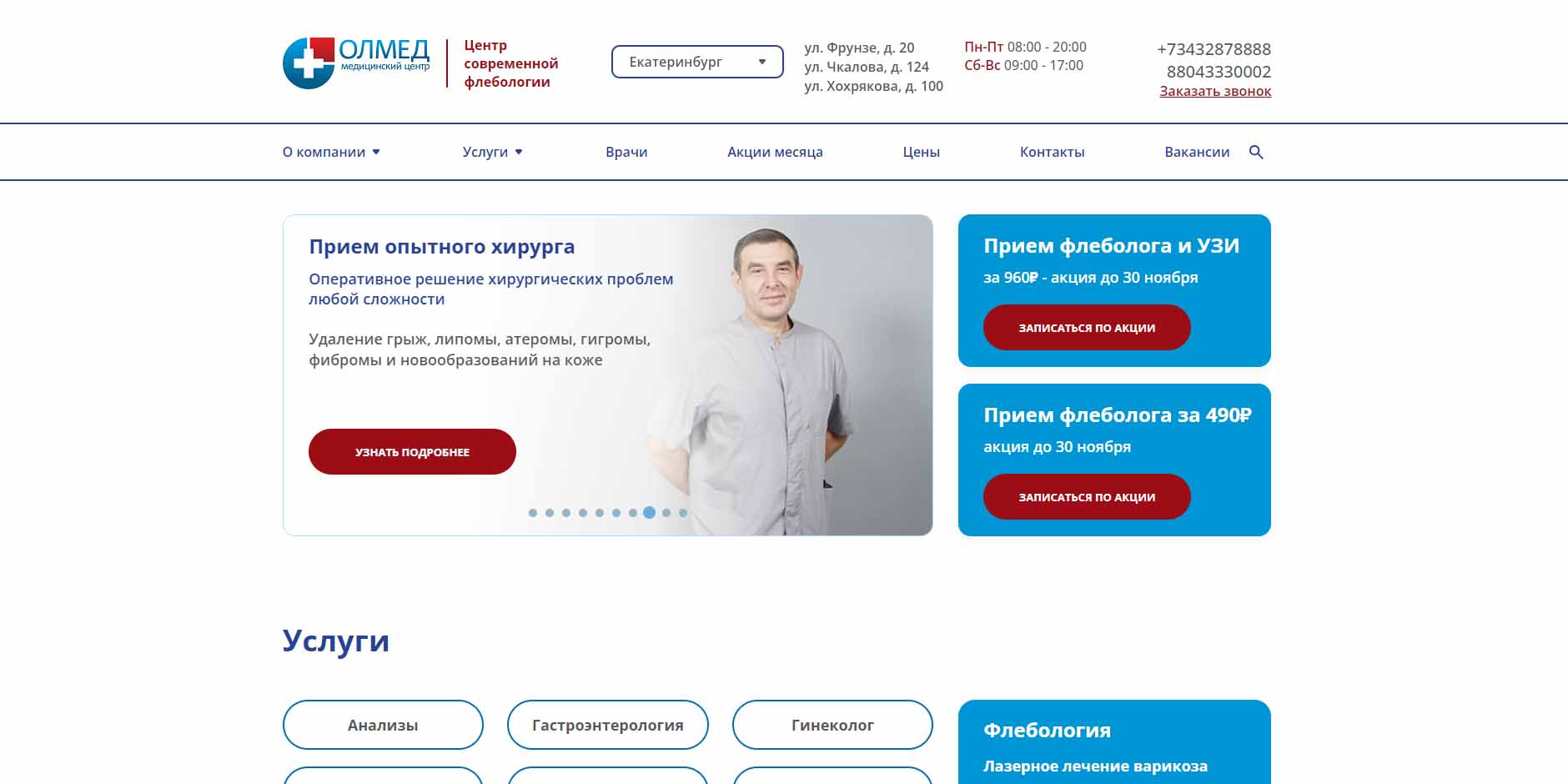 Клиника специализируется на флебологии и лазерной хирургии. Чаще всего используют такие методики, как минифлебэктомия, микросклеротерапия, криолазер криосклер (КЛаКС) и эндовенозная лазерная коагуляция (ЭВЛК). Проводят профессиональную УЗИ диагностику вен ног на аппарате экспертного класса.