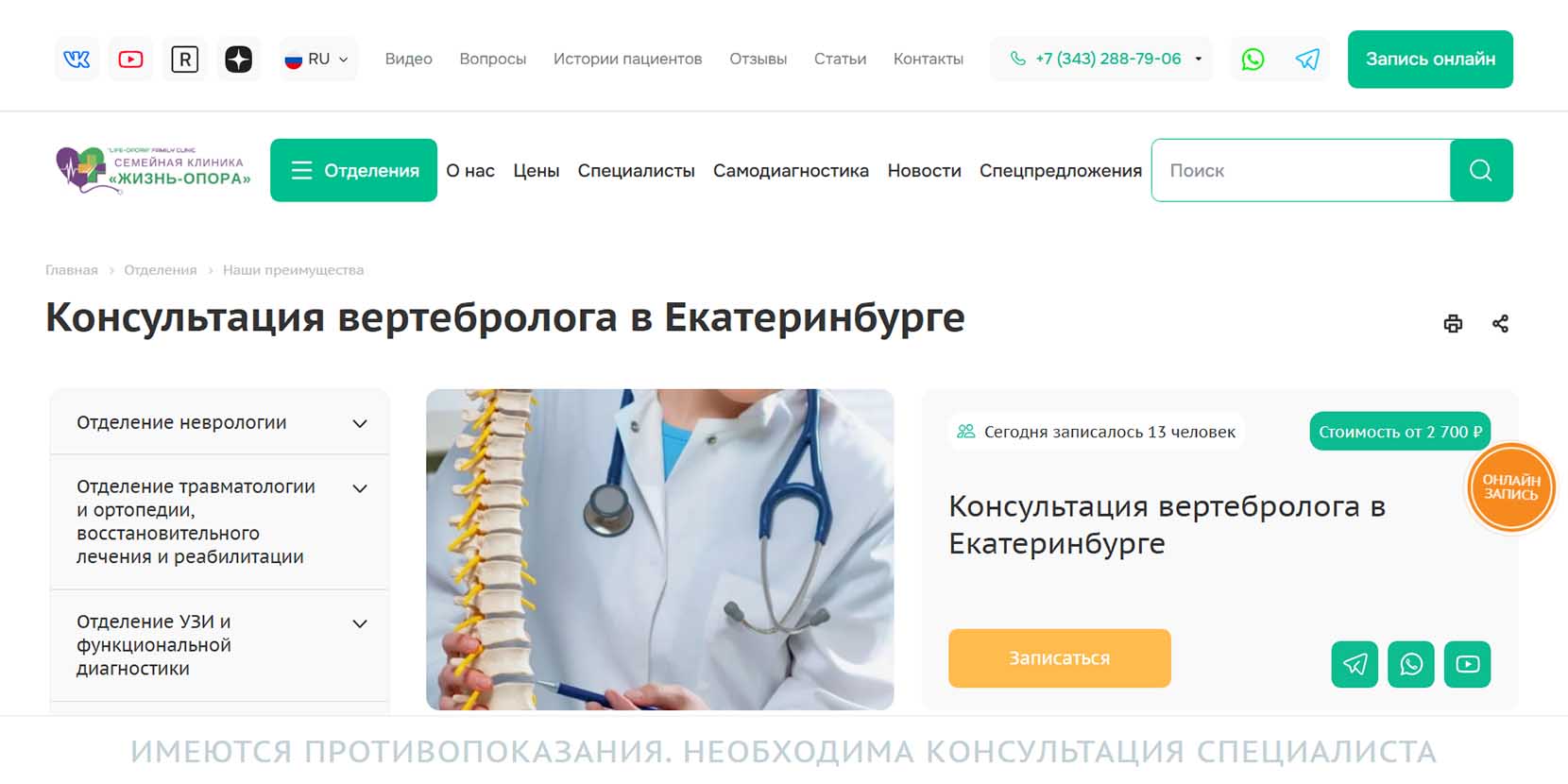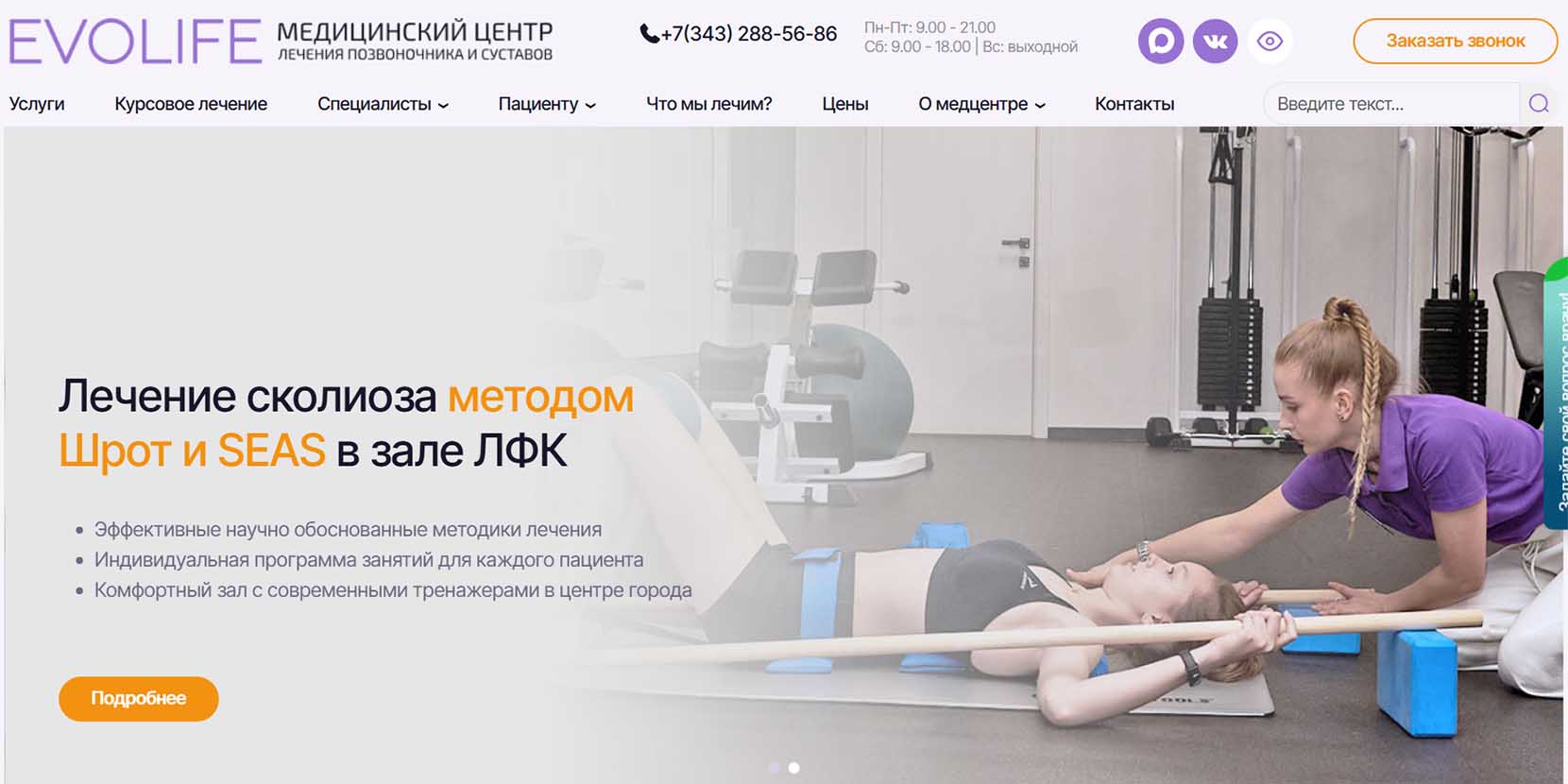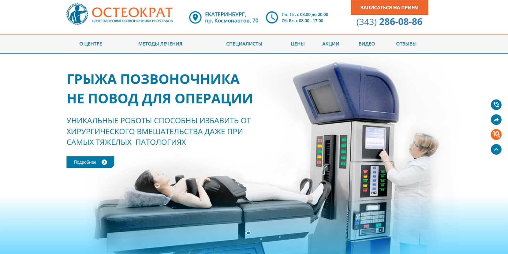 Федеральная сеть клиник, где ждут пациентов со следующими симптомами: ноющая боль в спине, резкие боли, «прострелы», отеки, скованность движения, онемение конечностей. Лечат заболевания позвоночника и суставов, используя передовое оборудование и новейшие разработки мировой медицины. Прием ведут опытные врачи неврологи и травматологи-ортопеды, также есть консультации терапевта, вертебролога, рефлексотерапевта. В Екатеринбурге клиника работает с 2013 года.
