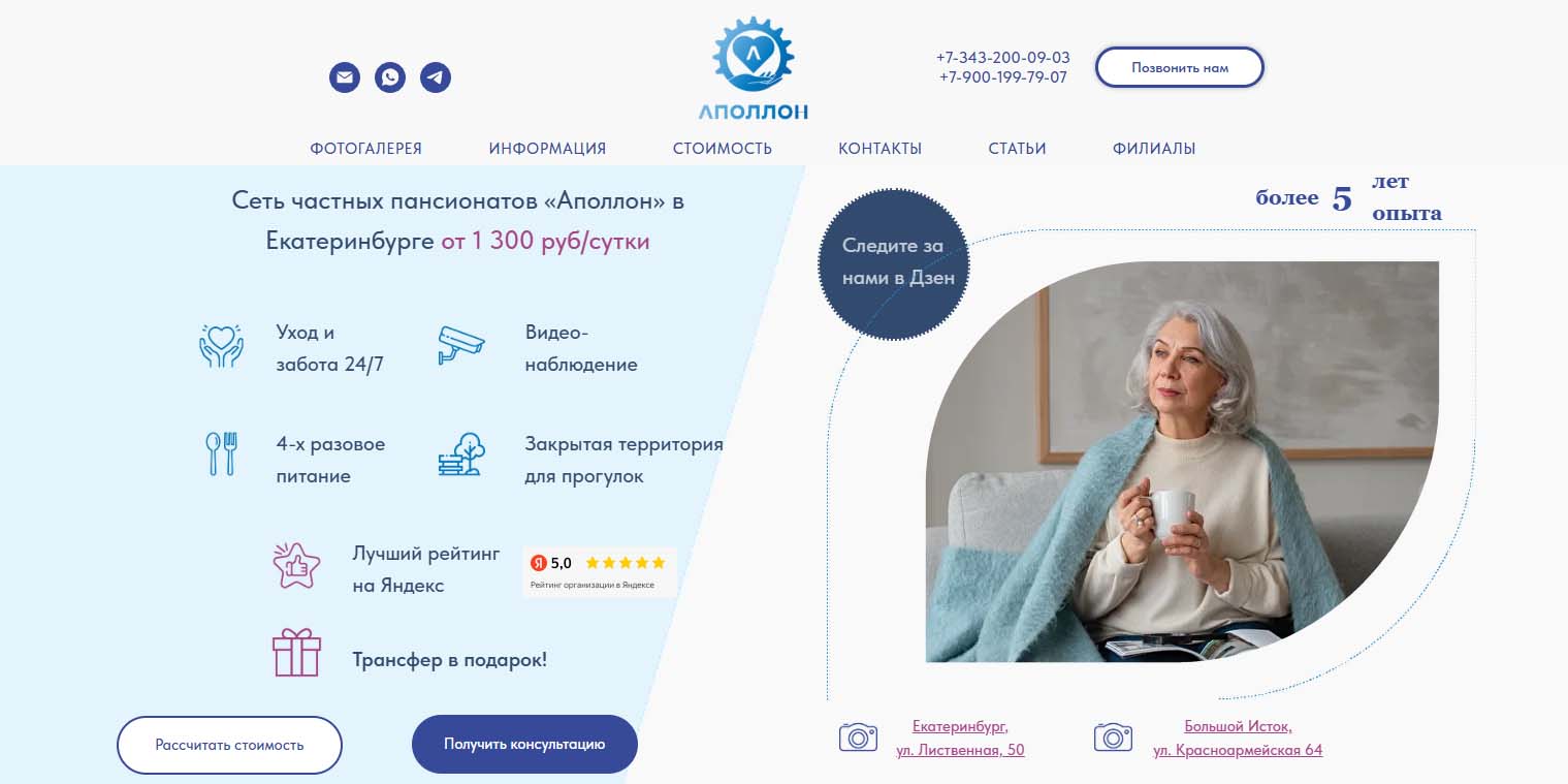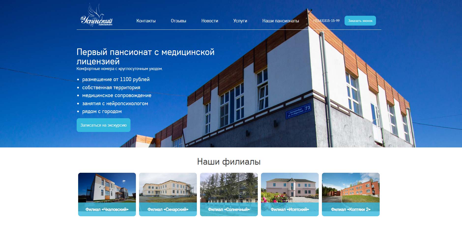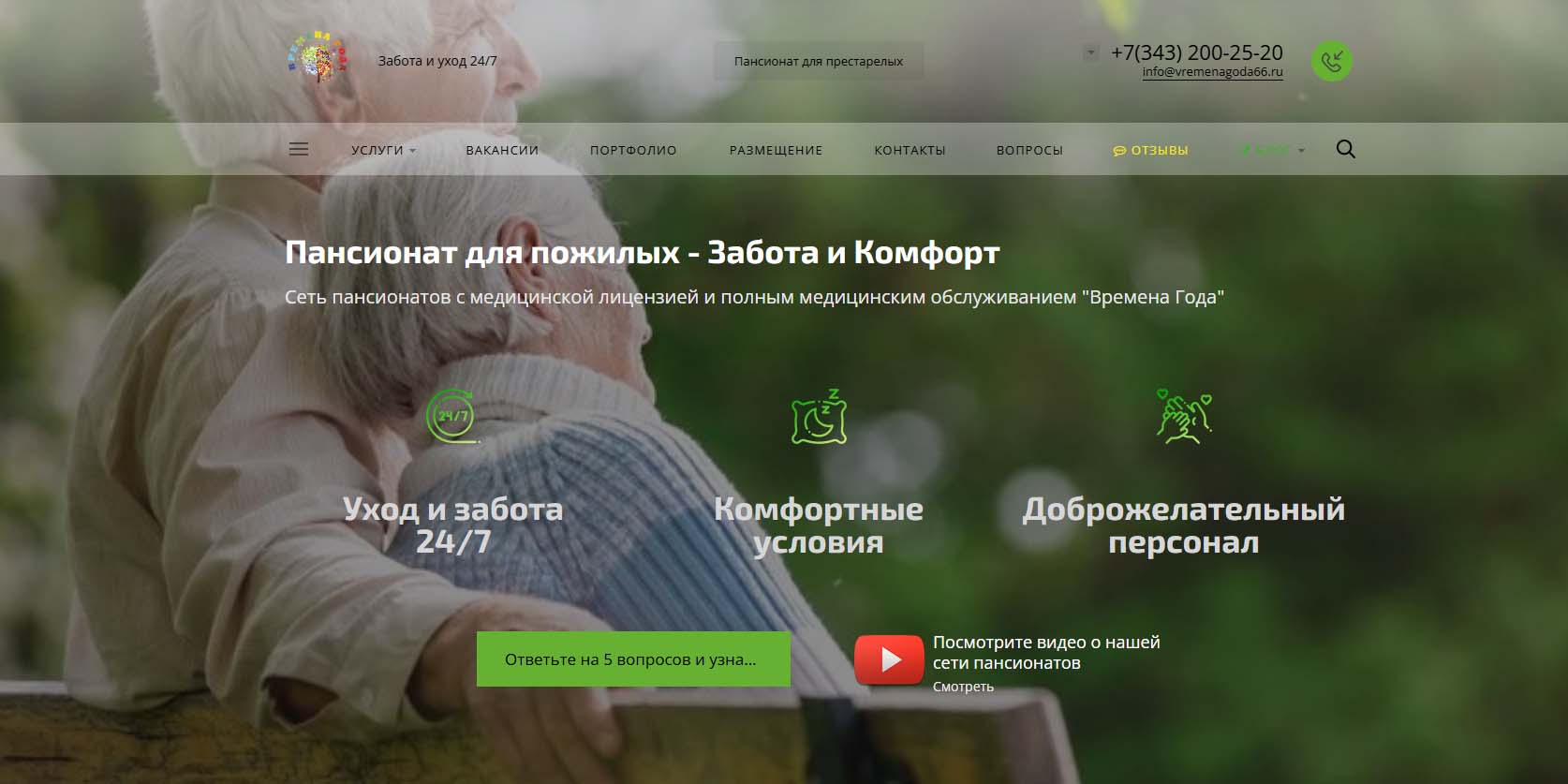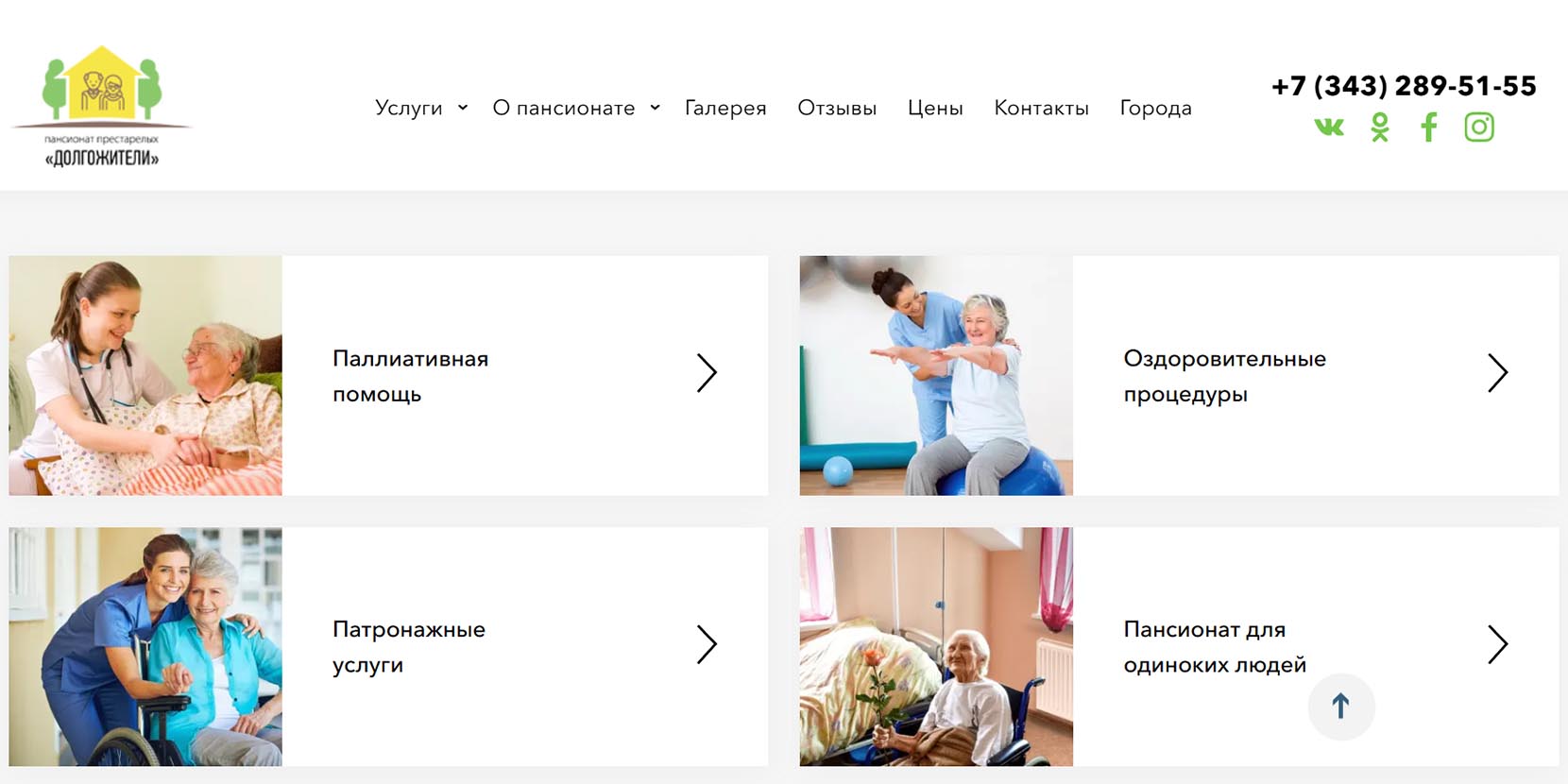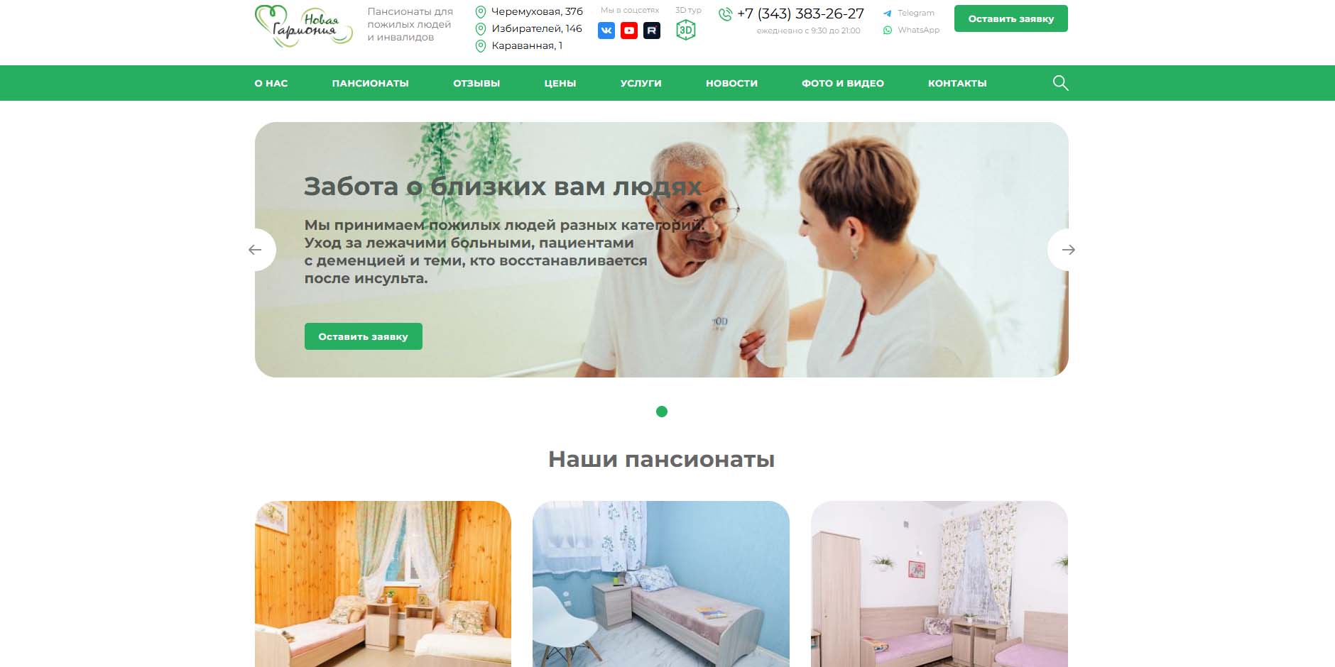 Сеть пансионатов в черте города. Здесь возможно постоянное или временное пребывание пожилых людей. Принимают как самостоятельных активных пенсионеров, так и лежачих пациентов, а также с деменцией, склерозом, сахарным диабетом и заболеваниями, снижающими умственную деятельность. Профессиональные сиделки обеспечивают уход круглосуточно. Постояльцы могут рассчитывать на регулярные визиты терапевта, помощь в соблюдении рекомендаций врачей, ежедневный контроль показателей здоровья, а также прогулки и интересные развлекательные и культурно-массовые мероприятия.