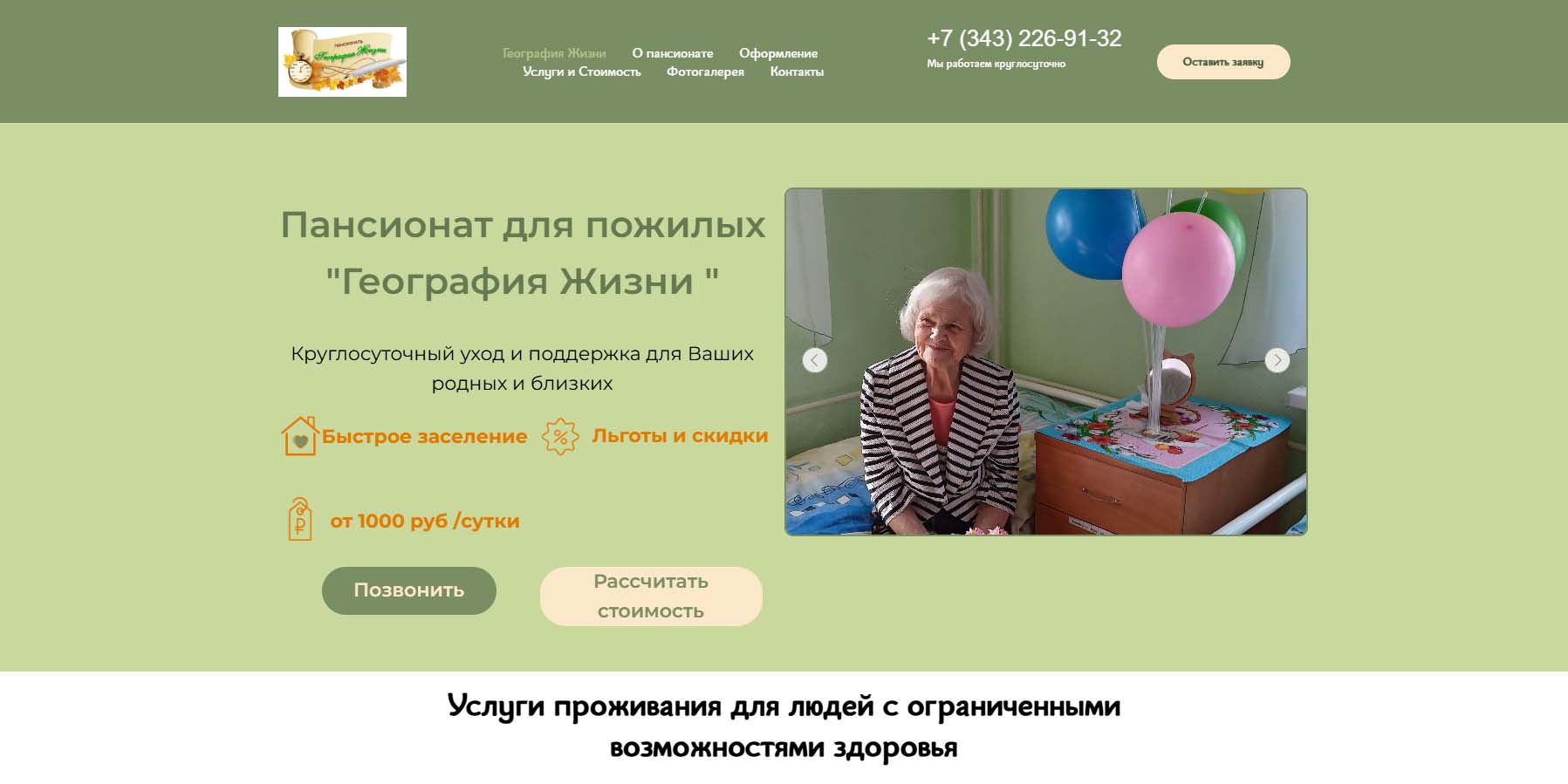 Работает больше 5 лет. Расположен в тихом районе малоэтажной застройки города Екатеринбурга. В пансионате обеспечены комфортные условия для проживания людей с ограниченными возможностями: есть функциональные кровати, ходунки, кресла-коляски. Здесь осуществляют контроль за приемом препаратов, проводят фитнес-занятия и индивидуально подбирают сбалансированный рацион питания для постояльцев. Принимают пожилых с деменцией, болезнью Альцгеймера, Паркинсона, после инсульта.