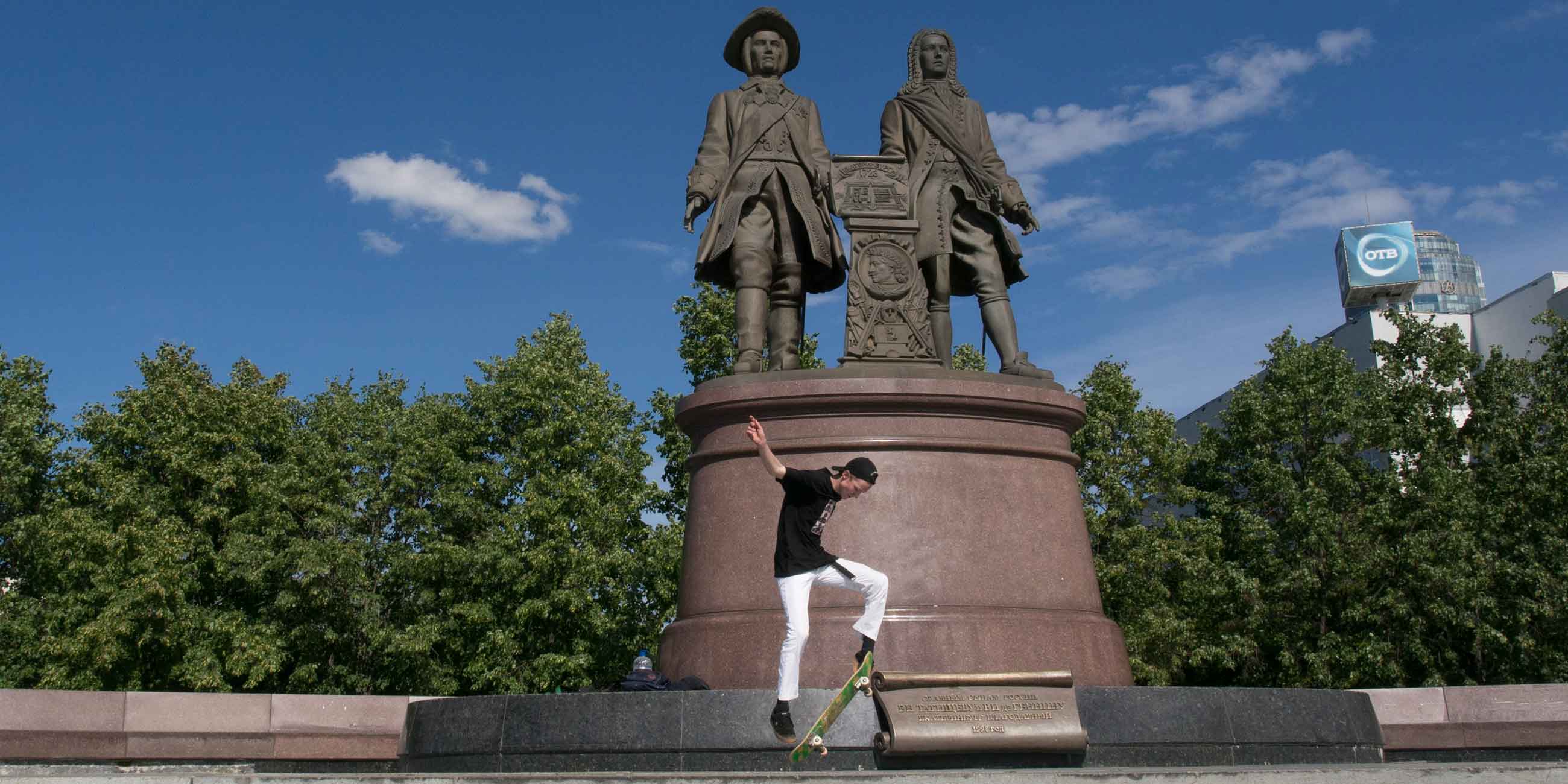 А если вы сразу очутились на мосту и за его ограждением видите танцующие фонтаны и слышите, как пенится под вами вода, спуститесь по лестнице вниз и пройдите мимо памятника основателям Екатеринбурга – Вильгельму де Геннину и Василию Татищеву. Эту парочку в народе прозвали Бивисом и Баттхедом из одноименного американского мультсериала. Рядом с ними в теплые деньки часто можно увидеть скейтбордистов, исполняющих опасные трюки.