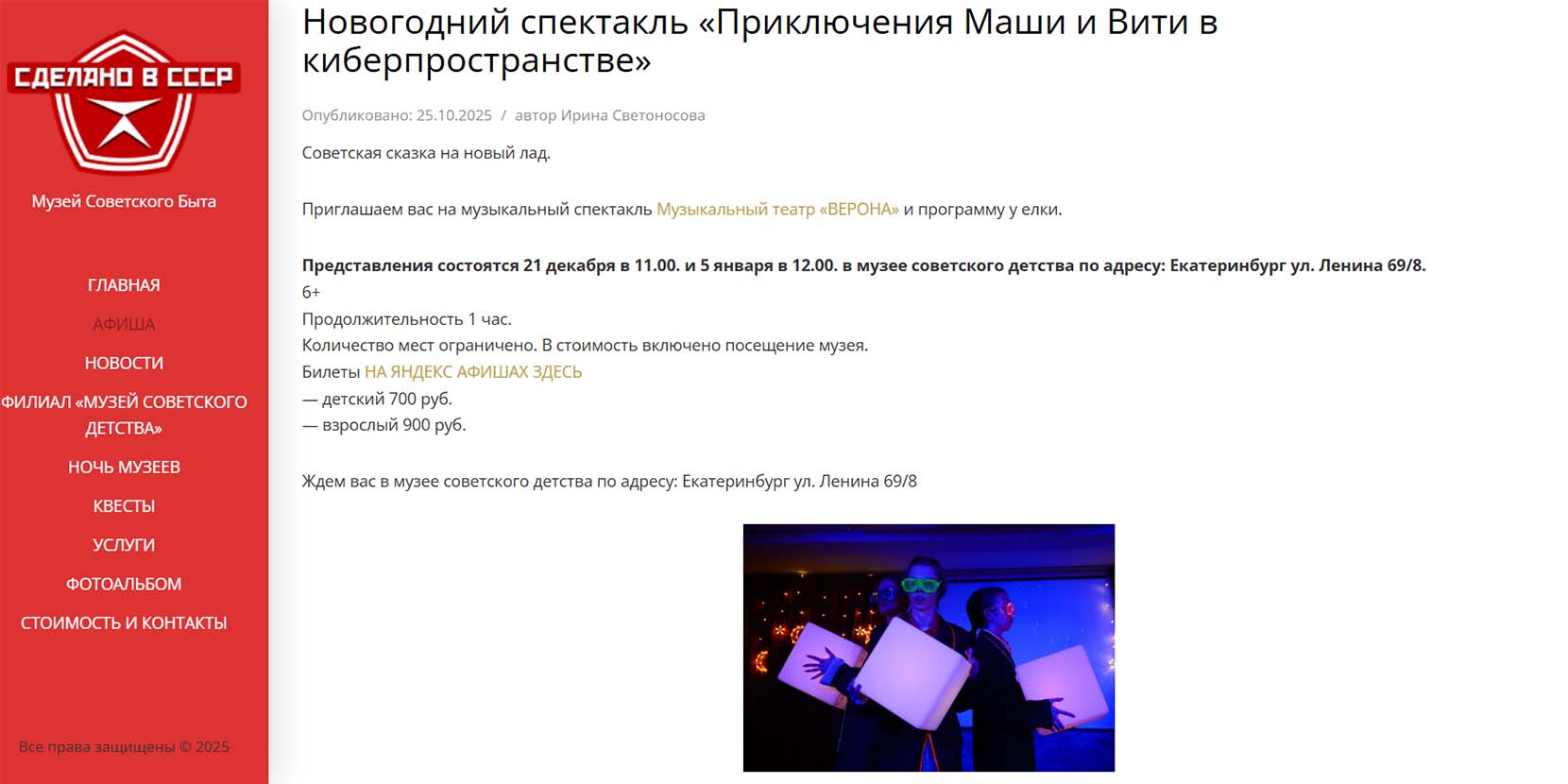 Зрителям будут представлены детский музыкальный спектакль и добрая история о дружбе героев. Маша и Витя готовы к приключениям и спасению красавицы Снегурочки. Для этого им нужно найти заветные кнопки и попасть в киберпространство. Дети будут в восторге от подвижных игр, а их родители — от старых добрых песен.