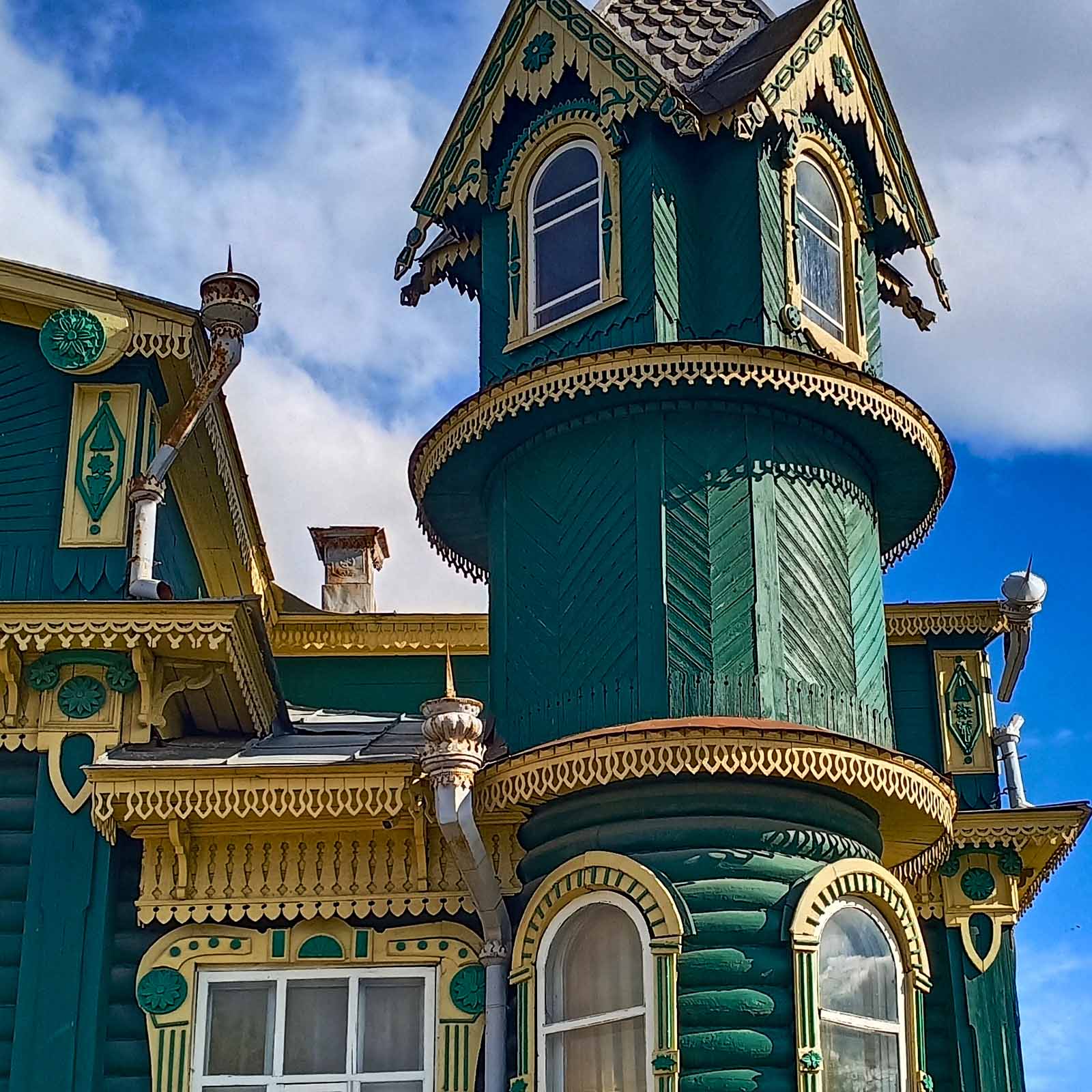 Посмотрели: дом предпринимателя и судостроителя Ивана Александровича Шорина (сегодня Дом творчества и ремесел), похожий на сказочный терем, – причудливый образец гороховецкого деревянного зодчества конца XIX-начала XX веков, в котором изящно переплелись русский стиль и модерн. Терем имеет две башни, квадратную и круглую. Обратите внимание на уникальную правую башенку, сложенную из идеально гнутых по кругу (неведомым способом, видимо, под горячим паром) толстых бревен. Невероятно, как это удалось местным мастерам!
