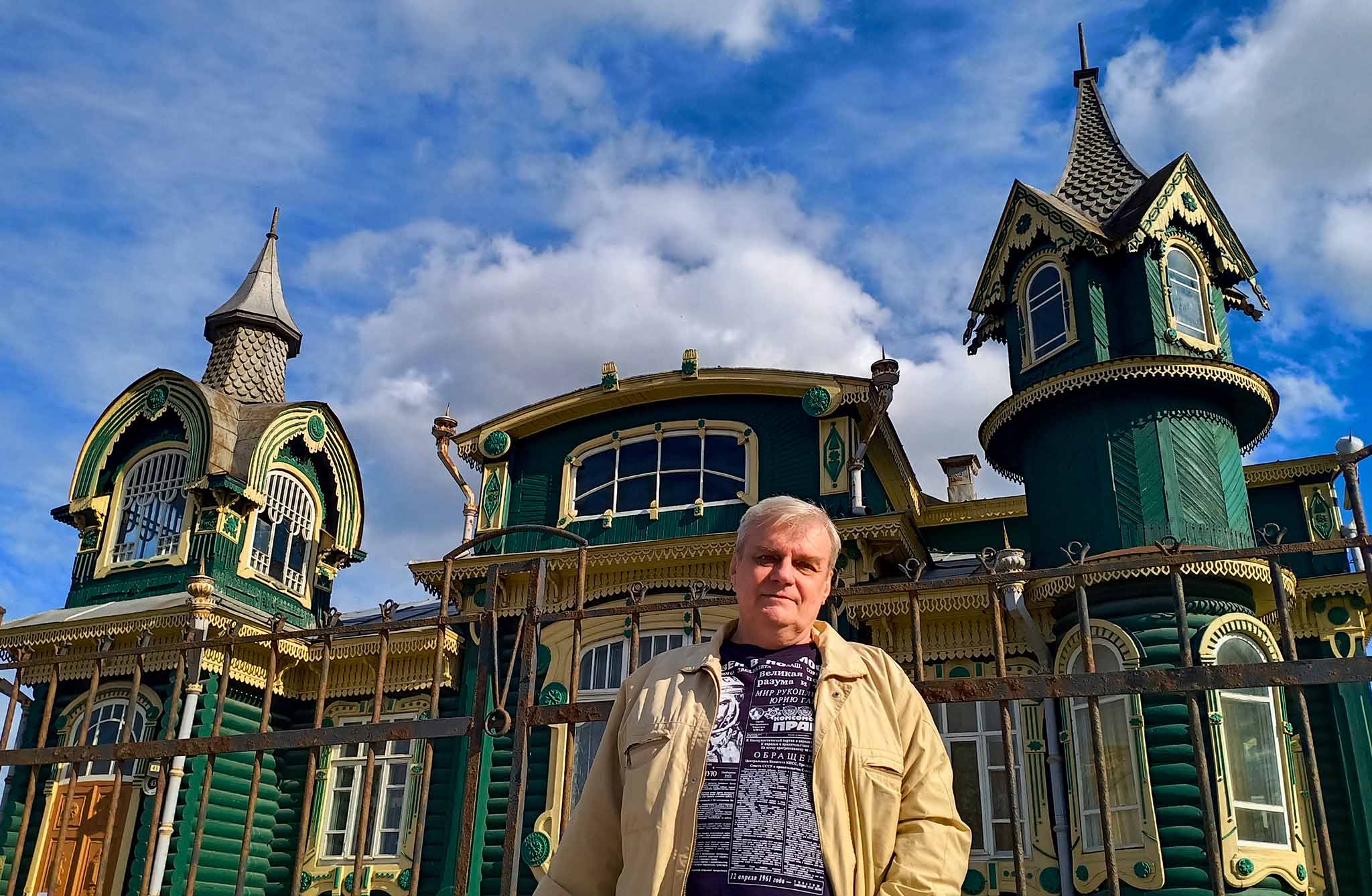 Остановились попить чайку из термоса у теремка «Дом Шорина». Он является визитной карточкой города и расположен справа прямо на трассе М7 (ул. Московская, 43), мимо не проедешь.