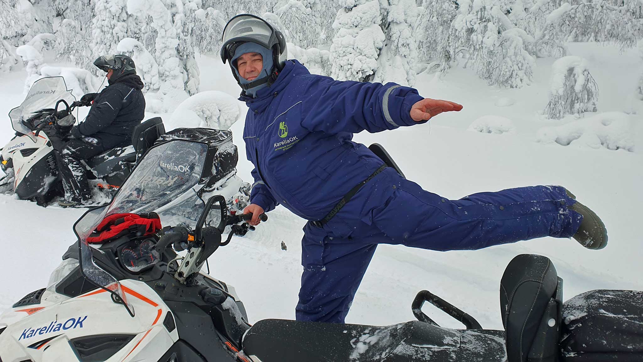 Проблема в том, что под снегом есть еще старые колеи, которые успели подмерзнуть и на которых снегоход скачет, как бешеный конь. Первая реакция — слегка притормозить, чтобы тебя не выкинуло из седла. Но, как же говорили, нельзя. Утонуть не утонешь, но самостоятельно выбраться из этой каши точно не сможешь. Приходится звать на помощь гидов из старой знакомой туристической фирмы «Карелия ОК», с которой мы прошли немало маршрутов.