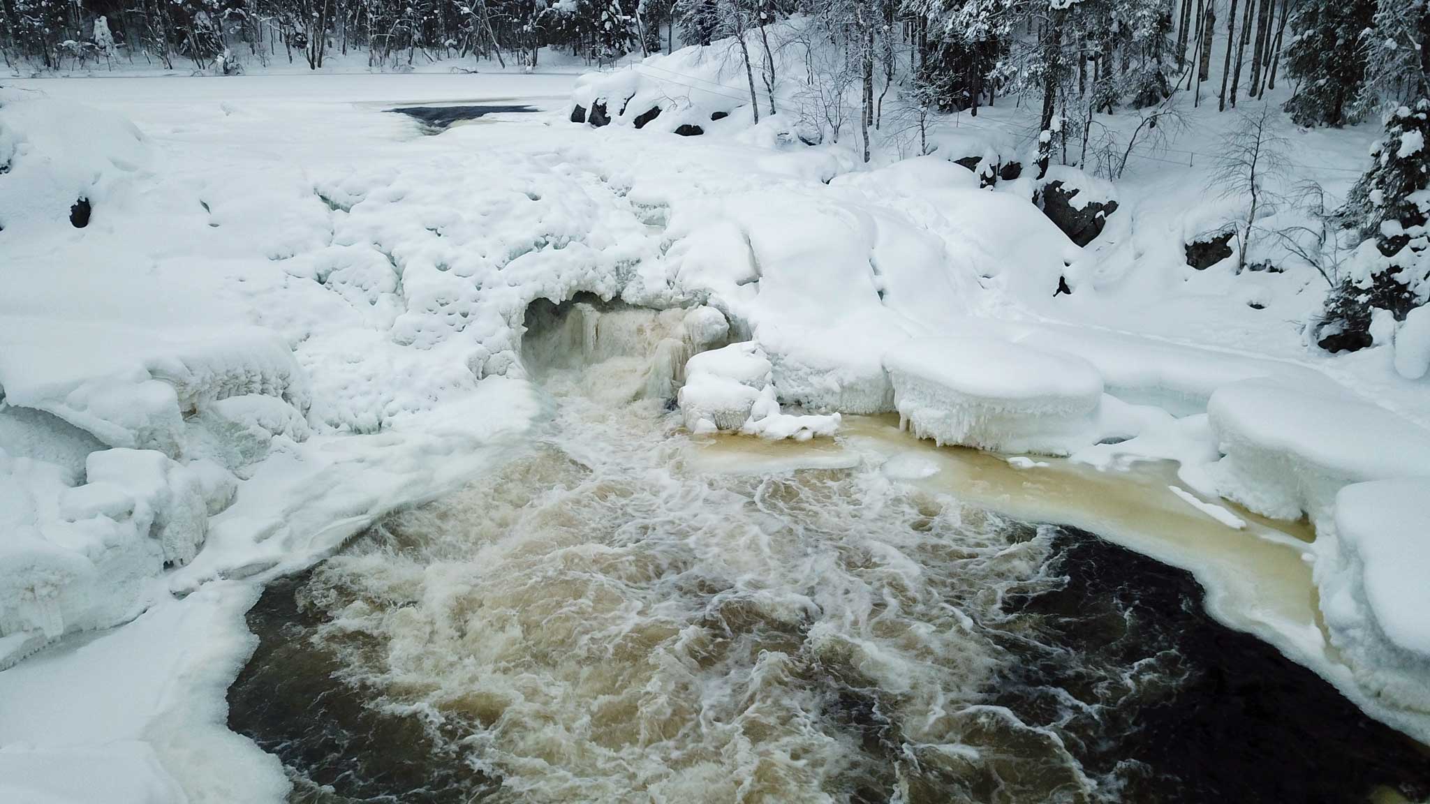 Карелия — не только край лесов и озер, но и — как ни странно — водопадов. Самый крупный из них носит такое же многоступенчатое имя, как и он сам, — Киваккакоски. На самом деле это ряд порогов реки Оланги общим перепадом 12 метров, а длиной — сотню. В секунду через него проходит 63 кубометра воды — половина железнодорожной цистерны! И это в спокойное зимнее время, когда даже сильнейшие морозы не способны сковать весь водопад льдом. Весной же настоящая Ниагара. Но именно зима наиболее красива здесь — из-за воды цвета лунного камня и обледенелых деревьев, словно склонившихся перед мощью природы.