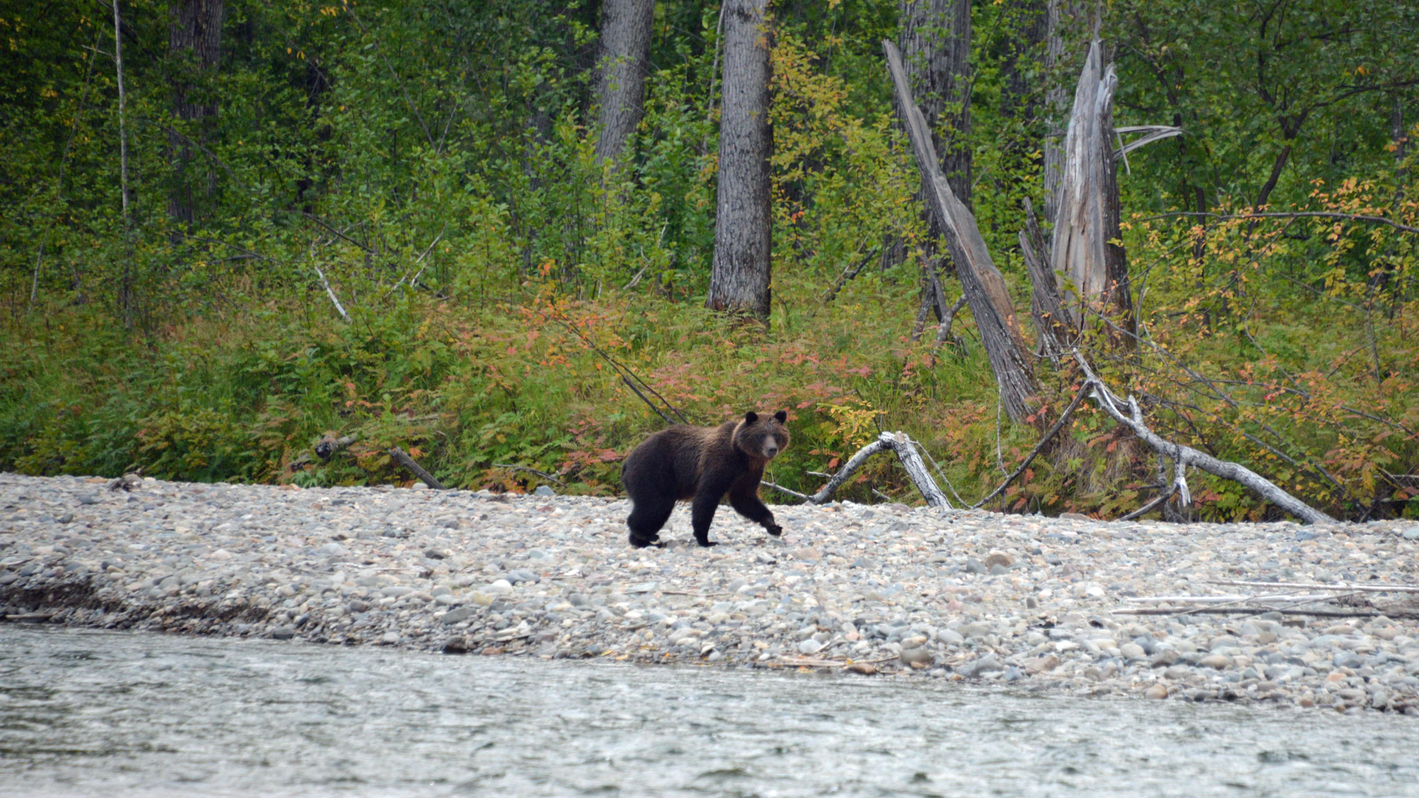 …А в это время на противоположном берегу огромный медведь, белогрудый стервятник, вышагивает вдоль реки по гальке. Лобастая голова опущена низко, весь будто захвачен какими-то думами, не смотрит по сторонам, не видит через реку ни палатки, ни костра, ни людей. Какая самоуверенность в его ленивых движениях!